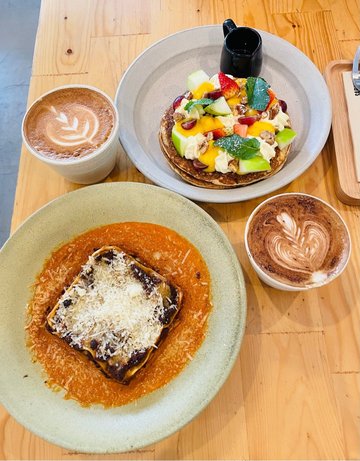 店內有即場烘焙咖啡豆,咖啡的香氣不停飄進鼻子裏,令人心曠神怡!說實話,食物味道並不特別好,只能是入口的水平,但是咖啡是一定要試,入口香濃回甘,層次多變!🌟Smoked lasagna(450THB) (煙燻千層麵)Smoked beef bolognese, bechamél, grana padano調味非常重,煙燻的牛肉干身硬口,見到外形都知道不會太好食💔🌟Coffee honey pancakes(380 THB) (咖啡蜂蜜煎餅)Mascarpone chantilly, lime curd, coffee honey, candied pecans, seasonal fruits, sourdough pancakes水果非常新鮮,豐盛的忌廉令人感動,餅是比較濕潤的口感!☕️Cappuccino☕️Latte店內的咖啡有品質保證,牛奶質感柔順如絲綢,整體入口香濃順滑而不酸澀!甜度剛剛好!…Read More