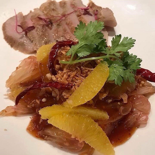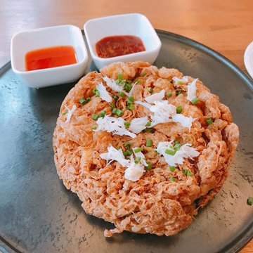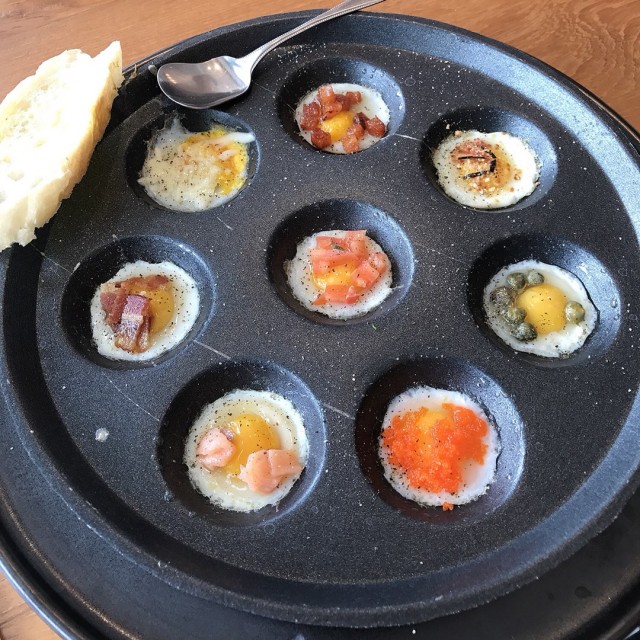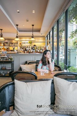 The Hen and The Egg ชื่อร้านที่สื่อความหมายง่ายๆ นั่นก็คือไก่กับไข่ ซึ่งจะเป็นซิกเนเจอร์ของร้านนี้ แม้ว่าจะเป็นวัตถุดิบธรรมดาๆ ในการทำอาหารแต่สำหรับ เชฟหนุ่ม ธนินธร จันทรวรรณ เชฟกระทะเหล็กที่โดดเด่นทางด้านเมนู Modern Cuisine ก็รังสรรค์ให้เป็นเมนูที่สวยงาม น่าทาน และรสชาติดีอีกด้วยครับ แต่ที่นี่ไม่ได้มีดีแค่ไก่กับไข่เท่านั้นนะครับ เพราะว่าเมนูอื่นๆ ก็มีให้เลือกอร่อยกันหลายเมนูทีเดียวก่อนที่จะพาไปชิมอาหารขอพาไปดูบรรยากาศร้านก่อนนะครับ The Hen and The Egg ตั้งอยู่ริมถนนหลังสวน การตกแต่งเป็นไปในสไตล์ตะวันตก ซึ่งเรียบง่าย แต่ดูดี ด้วยบรรยากาศที่เน้นสีโทนสว่าง ทำให้ดูโปร่งสบายตา และด้วยการตกแต่งร้านด้วยผนังกระจก ทำให้รับแสงธรรมชาติได้สบายๆ บวกกับความสวยงามของกระเบื้องและโต๊ะไม้ที่วางยาวอยู่กลางร้านทำให้ช่วยขับให้บรรยากาศในร้านดูเก๋ไปอีกแบบยังมีพื้นที่ด้านในอีกห้องที่เน้นการตกแต่งเรียบง่ายด้วยโทนสีขาว ตัดกับภาพกราฟฟิครูปไก่และไข่สีดำซึ่งเป็นสัญลักษณ์ของที่ร้านดูสวยงามไม่เบา นอกจากนี้ยังมีโซน outdoor ซึ่งเพิ่มสีเขียวสบายตาสำหรับใครที่ต้องการรับลมด้านนอกได้สบายๆสำหรับอาหารของที่นี่ไม่ได้มีดีแค่เมนูไก่กับไข่ แต่ยังมีเมนูอื่นๆ ที่มาในรูปแบบ All Day Breakfast ไว้ให้เลือกอร่อยกันหลายเมนู แต่ก่อนอื่นขอเริ่มด้วยเครื่องดื่ม Strawberry Smoothie (120 บาท) น้ำสตรอเบอร์รี่ปั่นได้รสชาติสตรอเบอร์รี่แบบเข้มข้น เพิ่มความสดชื่นได้เยอะเลยครับนอกจากนี้ยังมี Blue Hawaii เครื่องดื่มสีฟ้าสดใส รสชาติหวานนิดๆ ด้วยส่วนผสมของน้ำผลไม้ ถือว่าช่วยดื่มแล้วชื่นใจขึ้นมาเลยครับจากนั้นก็มาถึงด้านอาหารกันบ้างครับขอเริ่มที่เมนูซิกเนเจอร์ของร้านนั่นก็คือ Egg-E-Egg-Egg (145 บาท) มองผ่านๆ ก็คือไข่นกกระทาที่เราคุ้นเคยกันเป็นอย่างดี แต่เมนูนี้โดดเด่นด้วยท็อปปิ้งต่างๆ ไม่ว่าจะเป็นเบคอน, กุนเชียง, ชีส, ไข่กุ้ง, เคเปอร์, ปลาคัตสีโอะป่น และมะเขือเทศ-ผักชีฝรั่ง ที่ช่วยเพิ่มให้เมนูนี้รสชาติอร่อยครบรสมากขึ้น ที่สำคัญเสิร์ฟเก๋ไก๋บนกระทะหลุม แนะนำให้ทานตอนร้อนๆ จะทำให้รสชาติดียิ่งขึ้นครับต่อด้วยเมนูแบบไทยๆ แต่สไตล์อินเตอร์อย่าง ยำ 2 ส้มกับคอหมูย่าง (295 บาท) เป็นเมนูยำส้มโอและหมูย่างจิ้มแจ่วที่จัดจานมาได้อย่างสวยงาม และน่าทาน ตัวยำส้มโอนั้นรสชาติกลมกล่อมไม่จัดจ้านเกินไปนัก ส่วนหมูย่างก็นุ่ม อร่อยจิ้มกับน้ำจิ้มแจ่วรับรองเคี้ยวเพลินเลยจ้าจากนั้นก็ปิดท้ายด้วย ปูนิ่มทอดกรอบซอสพะแนง (275 บาท) เมนูนี้เห็นแล้วว้าว เลยครับ เพราะหน้าตาดูแล้วน่าทาน ปูนิ่มที่ทอดได้กรอบนอกนุ่มใน ตกแ