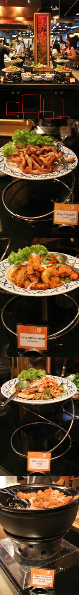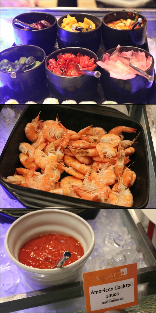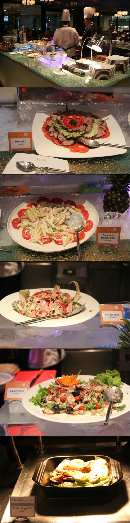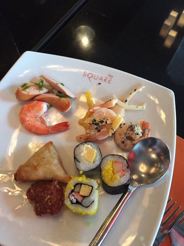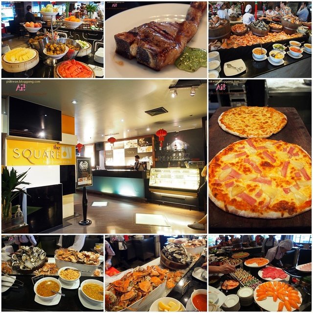 วันนี้จะพาไปกินอีกหนึ่งซันเดย์บรั้นช์ในรร.นะคะ กับรร.โนโวเทลสยามสแควร์นั่นเองงงงง ให้ดูภาพรวมของที่นี่ก่อนแล้วกันนะคะ สำหรับพิกัด รร.โนโวเทลสยามจะอยู่สยามสแควร์นะคะ เยื้องไปทางฝั่งอังรีดูนังค์ค่ะ วันนั้นเราวิ่งไปจากทางอนุเสาวรีย์ พอเลยแยกสยามฯ เลี้ยวซ้ายเข้าสยามสแควร์ซอย 7 รับบัตรจอดรถ (นำไปประทับตราที่รร.ได้นะคะ) แล้วก็วิ่งตรงไปเรื่อยๆ เลยสยามสแควร์วันไปก็จะเห็นอาคารรร.สีเหลืองๆ ทางซ้ายมือแล้วค่ะ ทางเข้าลานจอดรถอยู่ข้างรร.เลย (หันหน้าเข้ารร. เป็นซอยทางขวามือค่ะ) หลังจากจอดรถเรียบร้อยแล้วก็เดินขึ้นไปที่ล็อบบี้ค่ะ ตัวห้องอาหารเดอะสแควร์จะอยู่ที่ชั้น 2 ของโรงแรมนะคะ สำหรับราคาซันเดย์บรั้นช์ที่นี่จะเป็น 1350++ เริ่มตั้งแต่เวลา 12.00-15.30 น. นะคะ เด็กอายุ 6-13 จ่ายครึ่งราคา ต่ำกว่า 6 ขวบ กินฟรีค่ะ ไปถึงก่อนเที่ยงเล็กน้อยค่ะ นั่งรอหน้าห้องอาหาร คนรอเยอะมาก แต่มีทั้งรอกินซันเดย์บรั้นช์และรอเข้าห้องอาหารจีนนะคะ พอถึงเวลาก็เข้าไปในห้องอาหารค่ะ เป็นห้องอาหารแบบเพดานค่อนข้างต่ำตามแบบรร.สมัยก่อนแหละนะคะ ที่นั่งกระจายตามขอบของห้องอาหาร และไลน์อาหารจะอยู่ตรงกลางห้องค่ะ อุปกรณ์บนโต๊ะนะคะ ไปดูกันนะคะว่ามีอะไรบ้างค่ะ เริ่มต้นด้วยไลน์เครื่องดื่มเลย บุฟเฟต์ที่ไหนรวมเครื่องดื่มให้ด้วยคือดีงาม แฮร่... ถัดไปเป็นไลน์ของหวานค่ะ มีทั้งเครปแบบทำให้ร้อนๆ เลือกท็อปปิ้งเองได้ และไอศกรีมซึ่งวันนั้นมีให้เลือกสองรสชาตินะคะ มีชากาแฟให้ด้วยนะคะ ไลน์ต่อไปจะเป็นส่วนของพวกยำต่างๆ นะคะ มียำทูน่า น้ำพริก ยำไก่กรอบ ซี่โครงหมูทอดและยำเซี่ยงไฮ้ค่ะ ผลไม้ค่ะ ชอบที่มีลำไยและกล้วยไข่ด้วยยยย ซุ้มต่อไปจะเป็นแนวอาหารอิตาเลียนนะคะ มีพิซซ่าและพาสต้าค่ะ ซุ้มนี้จำไม่ได้แล้วว่าเป็นเนื้อหรือหมูนะคะ เมนูฮอทดิชค่ะ มีทั้งข้าวและกับข้าวต่างๆ นะคะ มีทั้งไทยๆ และฝรั่งค่ะ ต่อไปเป็นมุมขนมหวานนะคะ มีทั้งขนมฝรั่งและไทยเช่นกัน ส่วนอีกฝั่งจะเป็นช็อกโกแลตฟองดูว์นะคะ ต่อไปจะเป็นอีกหนึ่งเมนูที่ไม่ควรพลาดนะคะ กับสเตชั่นกริลล์ ซึ่งมีฟัวร์กราส์อยู่ด้วยค่ะ ถ้าไม่กินฟัวร์กราส์ก็มีหมู แกะ และไก่ค่ะ สำหรับการสั่งก็เอาเบอร์ที่โต๊ะมาแล้วก็ติ๊กในใบดังกล่าวนะคะ แต่ต้องเช็คดีๆ ค่ะ เพราะบางเมนูไม่มีในซันเดย์บรั้นช์นะคะ มีสำหรับดินเนอร์ค่ะ สอบถามพนักงานเอาแล้วกันนะคะ อย่างวันที่เราไปวันนั้นไม่มีกั้งกับเนื้อวัวค่ะ ใกล้ๆ กันจะมีข้าวผัดและกะเพราด้วยค่ะ แต่ไม่ได้ชิมเลยง่ะ แหะๆ ต่อไปไปดูที่ไลน์ตรงกลางห้องกันบ้างค่ะ มีแซลม่อน และซีฟู้ดต่