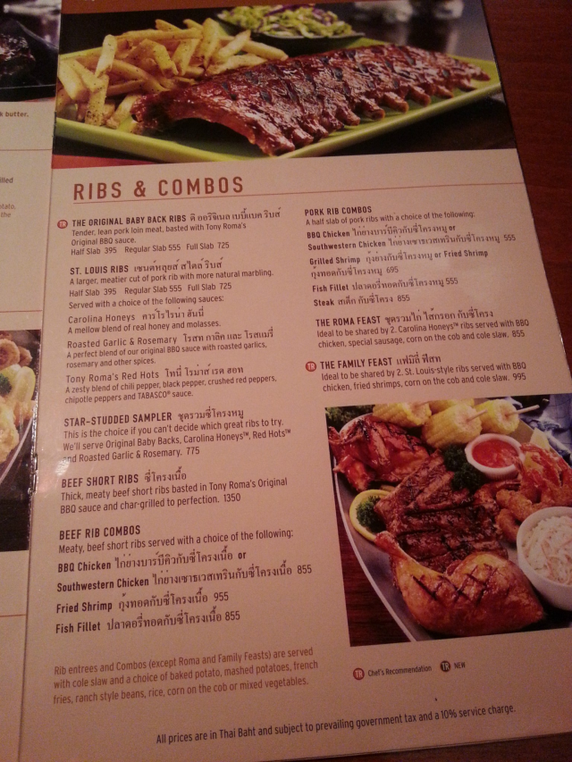 Tony Roma's ร้านสเต็ก ริบส์ แล้วก็ซีฟู้ดจากอเมริกา ร้านนี้เค้าบอกเลยว่าเค้าขึ้นชื่อในเรื่องของ Baby Rack Ribs มากครับ ผมเคยทานครั้งแรกก็ที่สาขาพารากอน จำได้ว่าทานริบส์ของที่นี่ไปนี่ฟินหลับฝันดีไป 7 วัน 7 คืนได้ หลังๆเวลามีคนมาถามผมว่าอยากกินริบส์ต้องที่ไหนดี ผมก็มักจะแนะนำร้านนี้ต่อเสมอๆเลย เพราะนอกจากจะใหญ่มาเต็มแล้ว ยังเนื้อนุ่ม ซอสหวานอร่อยมากช่วงก่อนหน้าที่ผมจะไปทานร้านนี้ไม่กี่วันผมก็ได้ข่าวว่าสาขาพารากอนนั้นปิดไปซะแล้ว!! ไม่รู้เหมือนกันว่าเกิดไรขึ้น พอดีมาเดินอยู่ที่ Terminal 21 เห็นร้านนี้ก็เลยชวนเพื่อนมาทานดู พร้อมกับโปรโมทดิบดีว่า Ribs นั้นอร่อยจริงจัง แต่วันนี้ที่ได้เข้ามาทานแล้ว คุณภาพของทางร้านตกลงอย่างเห็นได้ชัดเจนมากครับ จากเมนูที่ผมเคยว่าอร่อยที่สุด ทานแล้วประทับใจ กลายเป็นเฉยๆไปเลยครับ[วิธีการเดินทาง]ร้านนี้ตั้งอยู่ที่ชั้น 4 ของห้าง Terminal 21 ร้านอยู่หน้าบันไดเลื่อนเลยครับ ขึ้นมาแล้วเจอทันที หาง่ายสุดๆ ห้างนี้ก็เดินทางมาได้ง่ายสุดๆเช่นกันด้วยรถไฟฟ้า BTS สถานีอโศกครับ เข้ามาแล้วเดินทางเชื่อมเข้าห้างมาได้เลยครับ หรือถ้าจะขับรถมาก็มีที่จอดในห้างด้วยเช่นกัน อย่าลืมนำบัตรจอดรถมาแสตมป์ด้วยนะครับ[บรรยากาศ/การบริการ]ร้านนี้บรรยากาศดูอึมครีม เงียบๆ ไฟแดงสลัวๆ ด้านในร้านมีที่นั่งค่อนข้างเยอะครับ มีที่นั่งริมหน้าต่างที่สามารถดูวิวถนนด้านนอกได้ด้วย อุปกรณ์การทานในแต่ละโต๊ะมีให้เรียบร้อยครับ พนักงานจะนำมาเสิร์ฟหลังรับออเดอร์เสร็จ ลูกค้าในร้านไม่ค่อยเยอะเท่าไรแม้ว่าจะเป็นช่วงเย็นๆก็ตามครับการบริการของพนักงานวันนี้ทำได้ครบไม่มีขาดตกบกพร่องอะไร ผมอยากลองทานเมนูอื่นๆบ้างเลยลองให้พนักงานแนะนำดูก็อธิบายได้ดีทีเดียวครับ อาหารมาเสิร์ฟไม่เร็วไม่ช้ามากเกินไป ระหว่างรออยากได้อะไรก็ถามพนักงานได้เลยครับ[รสชาติอาหาร/ความคุ้มค่า]ร้านนี้เน้นขายสเต็ก ซีฟู้ดกริลล์ แต่เมนูเด็ดที่เรียกได้ว่าเป็น Signature เมนูของทางร้านเลยก็คงจะเป็น Baby Rack Ribs หรือซีโครงหมูอบซอสบาร์บีคิวนี่แหละครับChicken Tenderloin (185 บาท)- เมนูนี้เป็นเมนูไก่ไม่มีกระดูกทอดเสิร์ฟมาบนสลัดผักพร้อมกับมาโยให้จิ้มทาน ก่อนสั่งผมถามพนักงานว่าทางร้านใช้ไก่ส่วนไหน พอได้รู้ว่าเป็นไก่ส่วนอกที่ผมชอบทานเลยสั่งมา แต่ไก่ของทางร้านนั้นจืดสนิทได้รสชาติมากครับ เหมือนไม่ได้เอาไปหมักอะไรใดๆมาทั้งสิ้น แถมยังมาแบบไม่ร้อนก็ไม่ฟินไปแล้วทอดนึง สรุปเมนูนี้ไม่โดนครับ (1/5)The Roma Feast (875 บาท)- วันนี้ทีแรกผมกะว่าจะสั่งเมนูโปรดของผมอย่าง Ribs แต่พอดีอยากลองเมนูอื่นๆด้วยเลย