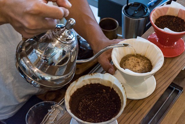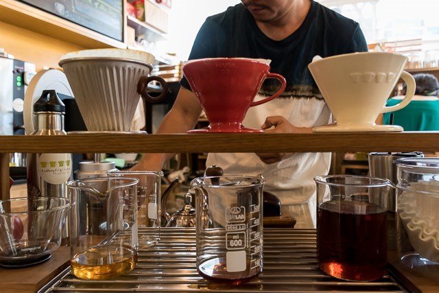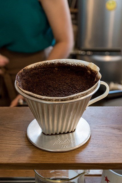 นอกจากจะมีหลากเครื่องมือ ยังเจออะไรใหม่ๆที่ไม่เคยเจอมาก่อน อย่างการใส่กาแฟจำนวนมากจนเกือบถึงริมขอบกรวยชง คนชงที่นี่คงมีฝีมือจริงๆที่ชงได้แบบนี้