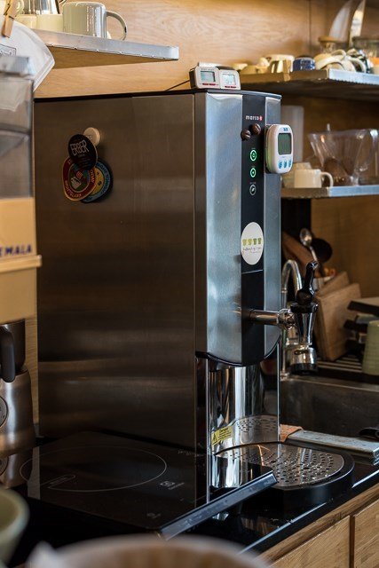 เครื่องทำน้ำร้อนโดยเฉพาะ เหมาะกับร้านที่ขายกาแฟดริปมากๆแบบนี้ แล้วยังมีเตาแม่เหล็กไฟฟ้าอยู่ข้างๆไว้คุมความร้อนอีกชั้นนึง