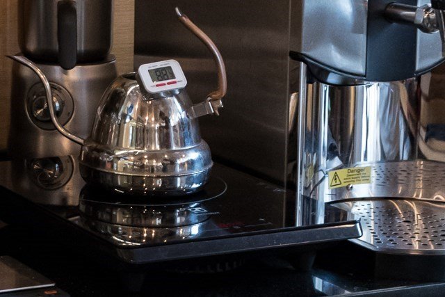 ไม่แน่ใจว่านี้เป็นอุณหภูมิที่ใช้ชงกาแฟที่นี่ แต่ตัวเทอร์โมมิเตอร์อ่านได้ต่ำกว่าที่ Specialty Coffee Association of America (SCAA - สมาคมกาแฟพิเศษของอเมริกา) แนะนำ ที่ 2ooF +/0- 5 F ฟาเรนไฮท์ หรือ 93.3C +/-2.7C เซลเซียส แต่อุณหภูมินี้หรือต่ำกว่านี้ผมเคยเห็นทั่วไปแถวนี้โดยเฉพาะที่ไต้หวันและฮ่องกง ขึ้นอยู่กับกาแฟ เขาว่าอย่างนั้น