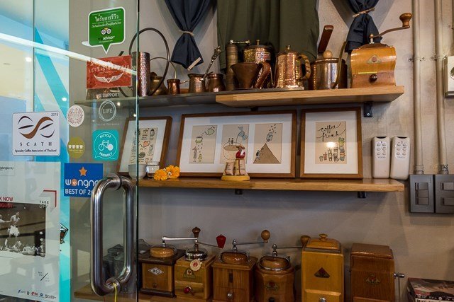 เครื่องบดกาแฟมือหมุนก็เพียบ เจ้าของที่นี่เค้าเป็นแฟนเครื่องบดประเภทนี้มาแต่ไหนแต่ไรแล้ว