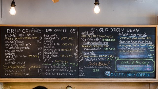 เมนูกาแฟ ชอบมากที่มีกาแฟดริปเยอะดี ข้อเสียคือน่าจะมีเทสติ้งโน๊ตอย่างชัดเจนให้รู้คร่าวๆว่ากาแฟรสชาดเป็นอย่างไร ถึงกับจะบอกรสแปลกๆ เช่น เหมือน โค๊กที่ทำในประเทศเม็กซิโก (Mexican Coke) ก็ยังพอช่วยให้เดาได้บ้างว่ารสน่าจะเป็นอย่างไร บางตัว อย่างป่าเมี่ยง ออร์แกนิค ดราย มีคำกำกับว่า “กาแฟของคนบ้า” ก็ไม่รู้ว่ารสชาดเป็นอย่างไร เท่าที่จำได้ตอนถามบาริสต้าเค้า ก็บอกให้ทานดูเองถึงจะรู้