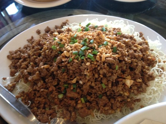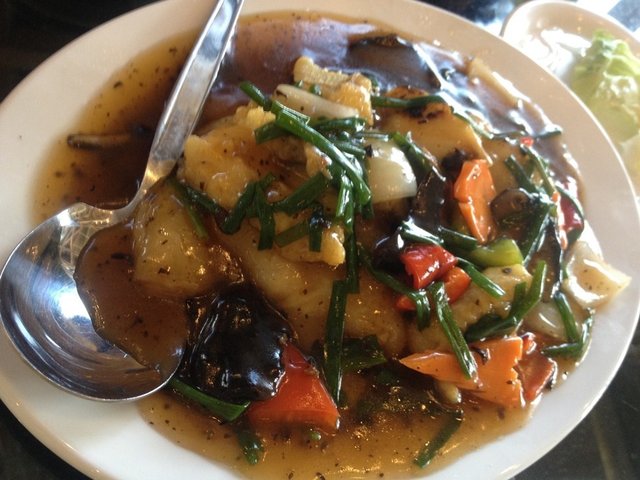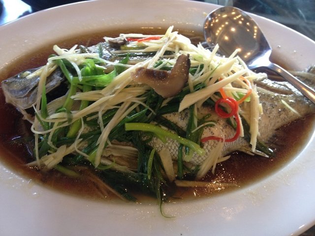 จานนี้เป็นปลากะพงนึ่งซีอิ๊ว เนื้อปลาสด หวาน อร่อยดีทีเดียว