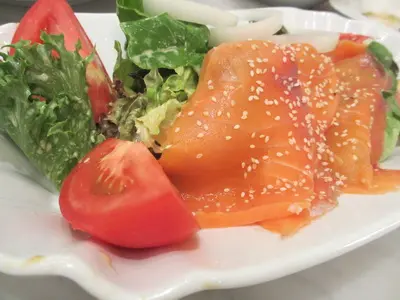 นัดเพื่อนไม่รู้จะมารอที่ไหน มารอที่นี่แหละนั่งสบายดี สั่งอะไรกินเล่นๆไปพลางๆ เอาแบบเบาๆและสุขภาพ สลัดปลาแซลมอนรมควัน 220 บาท แซลมอนรมควันชิ้นใหญ่แผ่นมาเบ้อเริ่ม มีมา 3 ชิ้น กับผักสดและน้ำสลัดที่รสเข้มข้น พอเพื่อนมาแจมก็สั่ง ไอศครีมเสาวรส 1 ลูก ก็ลูกใหญ่นะ แต่ก็ 75 บาท เปรี้ยวถึงใจสุดๆ เวลาชำระเงินมี Service Charge เพิ่มอีก 10%