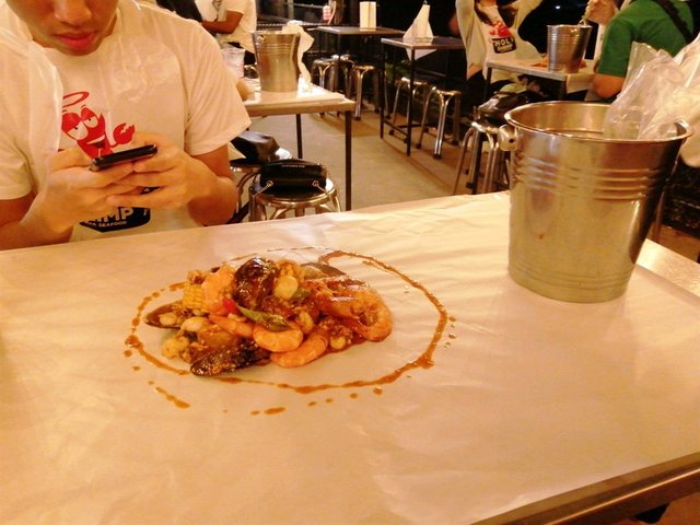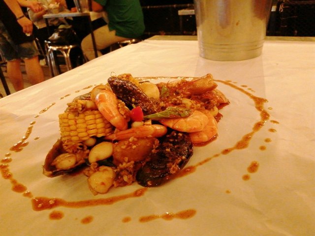 朋友推薦係夜市食呢間海鮮檔,樓上二樓座位,風景唔錯,望到下面的夜市,一開始俾個食法嚇親,因為呢間唔用碟裝食物,係直接鋪枱布,然後將熱辣辣的海鮮倒在枱面上,我地點左個多利蝦,399兌港元大約100蚊左右,好平,有蝦,有蜆,有薯仔,栗米,魷魚等,小辣已經好足夠,個辣椒汁好好味,如果有埋白飯就一流,海鮮都新鮮彈牙,配合醬汁好惹味。但兩個人食唔飽,點多個豬肋骨,個醬汁麻麻,所以我地將豬肋骨點返個海鮮辣汁,總之好好味。不過要小心件衫,好易沾到醬汁,因為洗唔甩。當然佢地有提供餐巾。