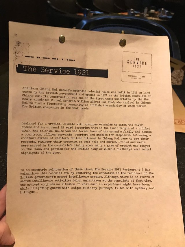 The Service 1921 Restaurant & Bar (Chiang Mai) URL: https://s.openrice.com/LcKSb01yTS8W0 Add.: Anantara Chiang Mai Resort&Spa, Charoen Prathet Road, Muang, Chiang Mai, Chang Khlan, Chiang Mai Tel.: +66 053-253-333