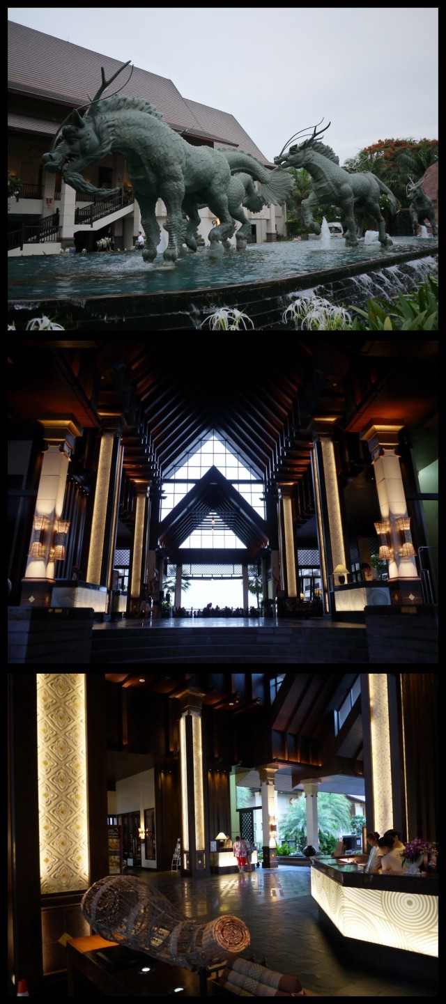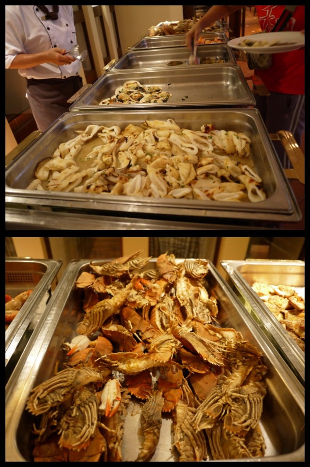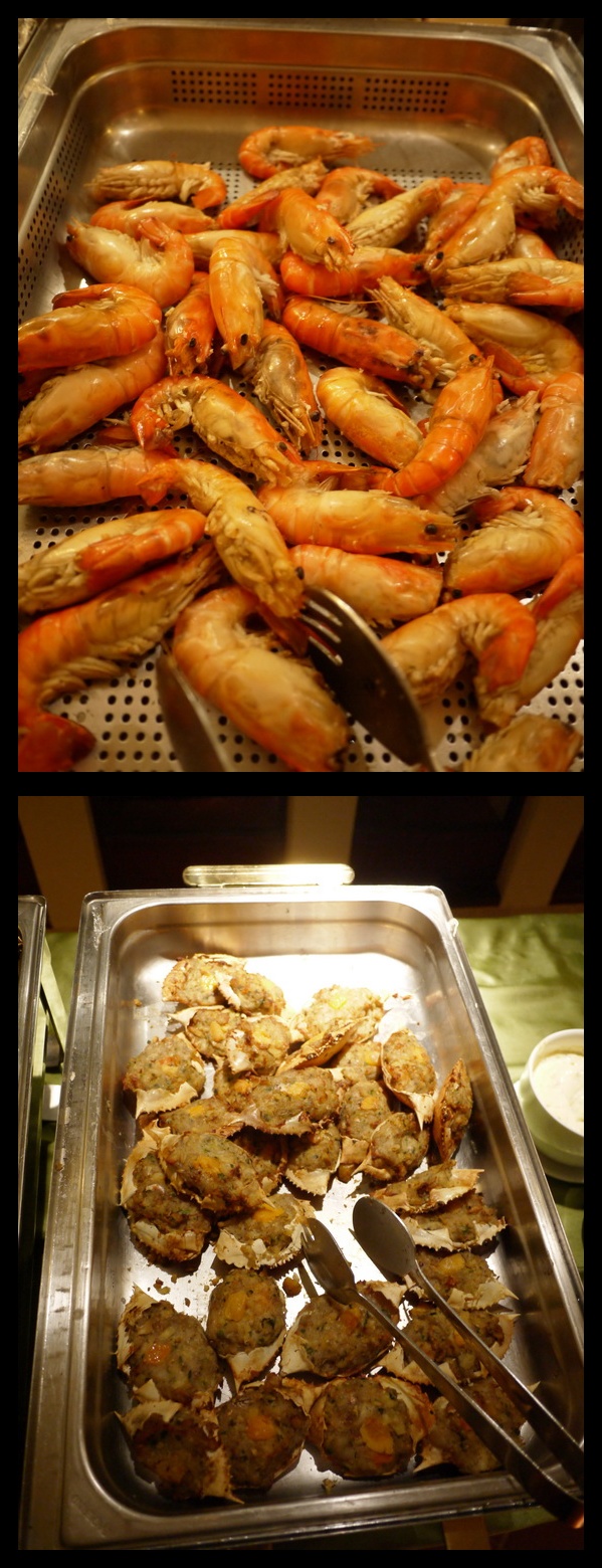 รร อยู่นาเกลือ ซอย 16 ลึกกกกกกกกกกกเข้าไปสุดซอยเลยค่ะ ขับเข้าไปเรื่อยๆ เลยนะคะ หลายกิโลอยู่เหมือนกัน มีป้ายบอกตลอดม้านิลมังกรหน้า รร กับล็อบบี้ห้องอาหารกั้งกระดานเยอะมาก มีไม่อั้น สดอร่อย กุ้งเป็นกุ้งนึ่งไม่ใช่กุ้งเผา ถ้าเผาจะอร่อยกว่านี้ ส่วนปลาหมึกเหมือนกับย่างมาไม่ค่อยสุก เลยทำให้ไม่กล้ากิน กลัวท้องเสีย เลยงานนี้กินกั้งเป็นอาหารหลัก น้ำจิ้มแซบรสถูกใจมากไลน์บุฟเฟ่ต์วางอยู่หน้าห้องเลยค่ะ ทุกถาดยังเต็มเรียบร้อยดี ยกเว้นถาด ปูม้านึ่ง เหลือแต่ก้ามเหี่ยวๆ ทิ้งไว้สองสามก้ามพอให้รู้ว่าเป็นถาดปูก็เลยตักมาเฉพาะเท่าที่เห็นก่อน เพราะคิดว่า อีกสักประเดี๋ยวเค้าคงเอามาเติมกินไปจนจะอิ่มแล้ว ก็ไปทวงถามว่าเมื่อไรปูจะมาอีก เค้าบอกว่า พี่มาช้า ปูหมด อ้าว บอกว่าห้องอาหารเปิด 6 โมงเย็น ตอนมาถึงแค่ 6.15 น. :( โอ้ยนี่บุฟเฟ่ต์แย่งชิงหรือไง