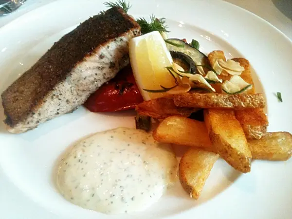 มาถึงจานหลักกันบ้าน Grilled Salmon แซลมอลย่างสุกเนื้อหวาน ทานกับผักย่าง ได้รสหวานของผักมากยิ่งขึ้น พร้อมมันฝรั่งทอดกรอบ มีน้ำราดมาด้านข้างให้ปาดทานตามชอบ จานนี้เลิฟมากมาย