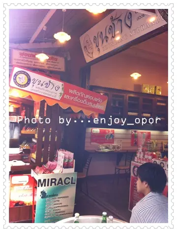 แวะเที่ยวตลาดสามชุกที่จังหวัดสุพรรณบุรี กับช่วงบ่ายแ่ก่ๆ ใกล้ง่วง เลยหาร้านกาแฟดับร้อนสักหน่อย ในตลาดสามชุก จัดว่าเป็ตลาดหนึ่งที่น่าเดิน ผู้คนไม่พลุกพล่านมาก สะอาดสะอ้านในระดับหนึ่ง แต่ของขายส่วนใหญ่จะเป็นร้านของฝากและเสื้อที่ระลึกสะมากมาย โดยขายสินค้าประเภทเดียวกันอยู่หลายร้านทีเดียว ขุนช้างสุพรรณบุรีเป็นร้านขายเครื่องดื่ม ไม่ว่าจะเป็นชา กาแฟ เครื่องดื่มสมุนไพร ผลิตภัณฑ์อบแห้ง ภายในร้านจัดมุมให้นักดื่มได้มีที่่จิบกาแฟและอ่านหนังสือไปด้วย แนวร้านก็แต่งสไตล์ย้อนยุคให้เข้ากับตลาดสามชุกส่วนโซนกาแฟสดนั้น มี 2 ราคา ร้อน 25 บาท เย็น 35 บาท สั่งเลยสดชื่นทุกอย่างโซนนี้ขายน้ำสมุนไพรและผลิตภัณฑ์อบแห้ง