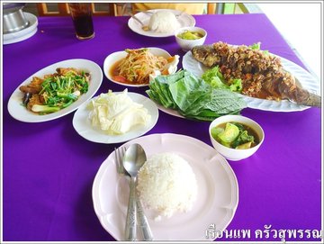 ร้าน เรือนแพ ครัวสุพรรณ สุพรรณบุรี เป็นหนึ่งในร้านอาหารที่มีชื่อเสียงของจังหวัดสุพรรณบุรีครับ แต่ไม่ได้ตั้งอยู่บนถนนเส้นหลักที่ผ่านสุพรรณบุรีนะครับ ต้องขับรถแยกจากถนนหลักที่ผ่านจังหวัดสุพรรณบุรี (ทางหลวงเส้น 340) เข้าไปใช้ถนนเส้นเลียบแม่น้ำท่าจีน (เส้นลำปลาซิว) ขับต่อไปไม่ไกลครับ จะเห็นร้าน เรือนแพ ครัวสุพรรณ สุพรรณบุรี อยู่ทางซ้ายมือครับร้าน เรือนแพ ครัวสุพรรณ สุพรรณบุรี เป็นร้านอาหารขนาดใหญ่ (มาก) เป็นทั้งร้านอาหารและรีสอร์ทที่พัก บรรยากาศดีมาก ติดแม่น้ำท่าจีน ในส่วนของร้านอาหารก็มีที่นั่งในในอาคารที่อยู่บนฝั่ง น่าจะมีห้องจัดเลี้ยงส่วนตัวให้บริการด้วยนะครับ เพราะสถานที่โอ่โถงมาก หรือว่าถ้าอยากสัมผัสกับธรรมชาติก็ต้องไปนั่งในแพที่ลอยอยู่ในแม่น้ำท่าจีนที่ท่าน้ำครับ แม่น้ำท่าจีนตอนที่ผ่านหน้าร้าน เรือนแพ ครัวสุพรรณ สุพรรณบุรี ไม่ค่อยมีคน จะเห็นธรรมชาติเขียวๆ ไกลสุดลูกตา น้ำใสมากๆ มีฝูงปลาตะเพียนหางแดงมาว่ายอยู่ที่แถวๆแพเยอะเชียวครับสำหรับอาหารที่ให้บริการก็จะเป็นอาหารไทย – จีน ทั่วๆไปนะครับ แต่ทางร้านจะเน้นอาหารพื้นถิ่น และอาหารทีทำจากปลาแม่น้ำส้มตำไข่เค็มจานนี้สอบตก (ในความชอบของเจ้าของบล็อก) ตั้งแต่ตอนยกมาเสิร์ฟ เพราะที่เอามาเสิร์ฟคือ “ตำไทยแนมกับไข่เค็ม” ในความชอบเจ้าของบล็อก “ตำไข่เค็ม” คือส้มตำที่ใส่ไข่เค็มลงไปตำด้วยกันจนไข่ละลายลงไปในน้ำส้มตำบางส่วน ทำให้น้ำส้มตำมีรสชาติมันๆ เค็มๆ รวมกับรสชาติเผ็ด เปรี้ยว หวาน ของส้มตำจะได้รสที่นัวๆเป็นเอกลักษณ์ของส้มตำไข่เค็มครับเฉพาะรสชาติของส้มตำจานนี้ก็อร่อยดีนะครับ เป็นรสชาติส้มตำแบบกรุงเทพฯๆ ที่คุ้นเคยกันดีครับปลาม้าเจี๋ยนขิง ราคา 190 บาทราคาจานนี้สูงนิดนึงนะครับ เพราะจานนี้เป็นปลาหายากที่มีชื่อเสียงของจังหวัดสุพรรณครับปลาม้าชิ้นหนาๆ ทอดมาแบบกรอบๆ หนังมีความหนึบๆนิดๆ เนื้อสัมผัสของปลาม้าอร่อยมากครับ เนื้อแน่นๆ มีความหนึบๆ แต่ ..... เค้าผัดเครื่องแล้วเอามาราดหน้าเฉยๆครับ เนื้อปลาม้าทอดเลยแทบไม่ได้รสชาติของเครื่องเจี๋ยนขิงที่หอมขิง ต้นหอม มีรสชาติเค็มๆ หวานนิดๆ เผ็ดขิงกับพริกชีฟ้านิดหน่อย .... น่าเสียดายครับ เมี่ยงปลาช่อน ราคา 250 – 300 บาทจานนี้รสดีมากๆครับ น้ำเมี่ยงเป็นเครื่องและสมุนไพรหลายๆอย่าง ตะไคร้ พริก หอมแดง ขิง ถั่วลิสงทอด กุ้งแห้งทอด คลุกเคล้ากับน้ำยำรสเค็มๆ หวานๆ เวลารับประทานจะต้องตักเนื้อปลาช่อนทอดกรอบ น้ำเมี่ยง ใส่ในใบคะน้ากรอบๆ ทานพร้อมๆกัน อร่อยมากเลยครับแกงเลียงปลากรอบ ราคา 180 บาทแกงเลียงรสเ