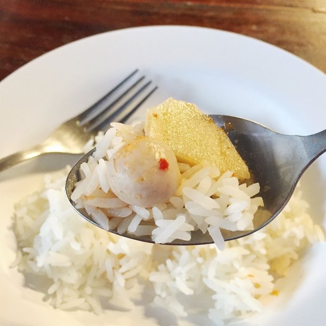 จานต่อมาแกงป่าลูกชิ้นปลากราย รสชาติน้ำแกงป่าอร่อย เผ็ดถึงเครื่องแกง ลูกชิ้นปลากรายเคี้ยวแล้วหนึบๆเด้งๆ ทานกับข้าวสวยร้อนๆ ฟินยิ่งกว่าฟินคะ