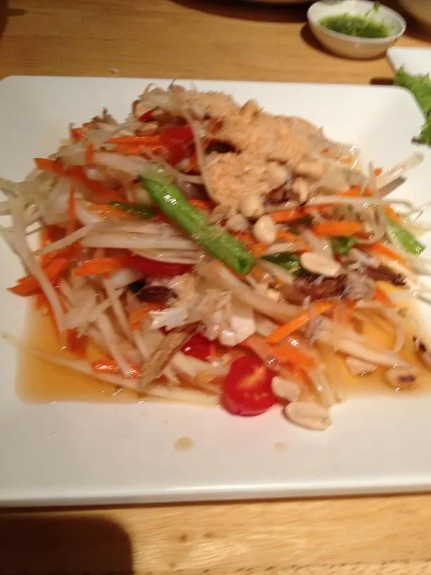 จานนี้สั่งกะว่าจะเอามากินเล่นแต่มาเป็นจานสุดท้าย เป็นส้มตำปูม้า รสชาติหวาน เปรี้ยว เผ็ด