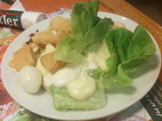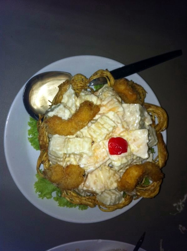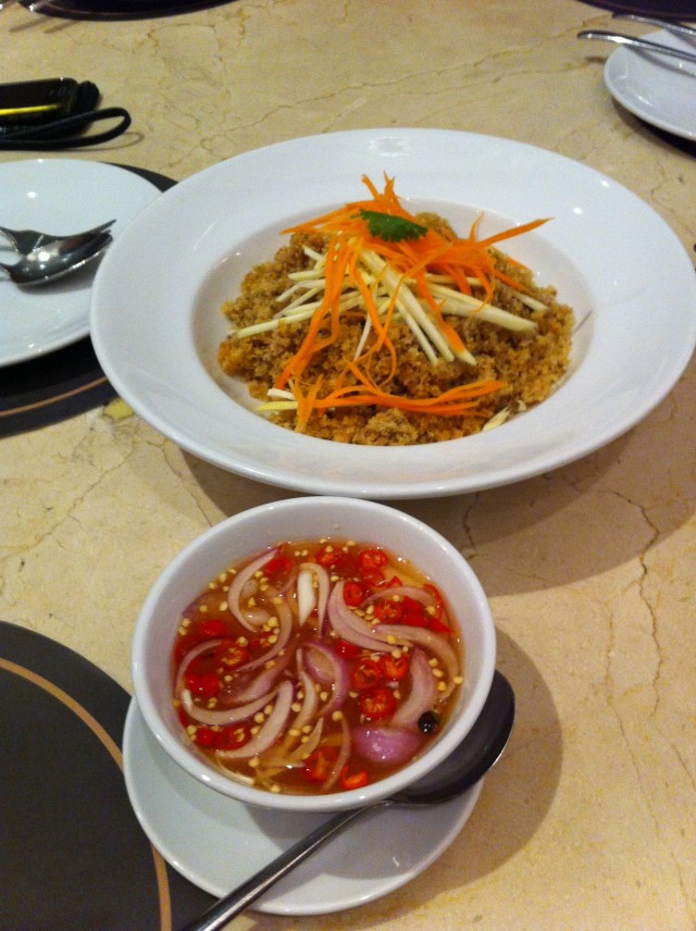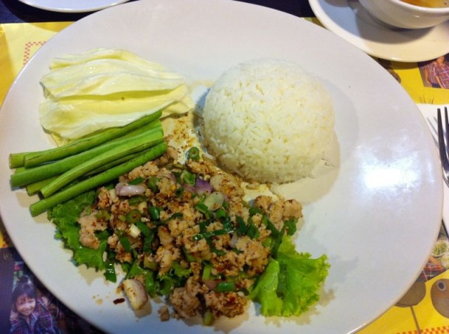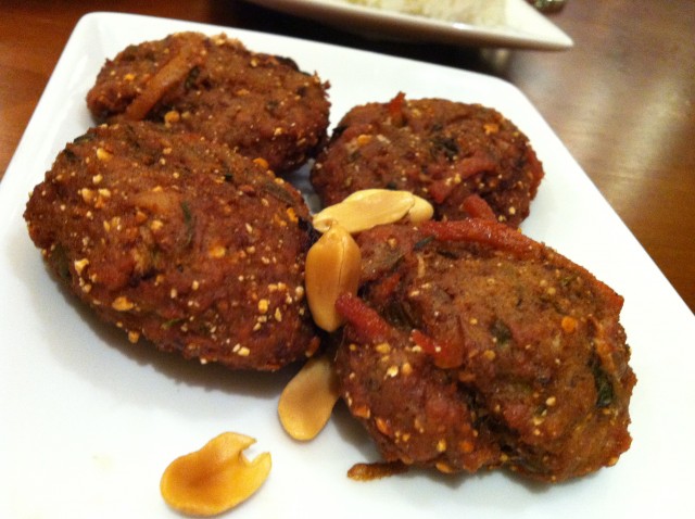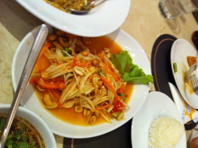จานนี้อร่อยค่ะ ไม่มันเกินไป ไม่มีแต่กระดูกด้วยล่ะ ต่อมาเป็นลาบหมูทอด จาก 6 ชิ้น เหลือ 4 ชิ้น (ถ่ายไม่ทัน แหะๆ) อันนี้เค็มไปหน่อยค่ะ ต้องกินข้าวตามเยอะหน่อย อิอิ แต่ทอดมานุ่มดีค่ะ ไม่กรอบจนแข็งเกินไป ส้มตำปลาทอด จานนี้อร่อยค่ะ