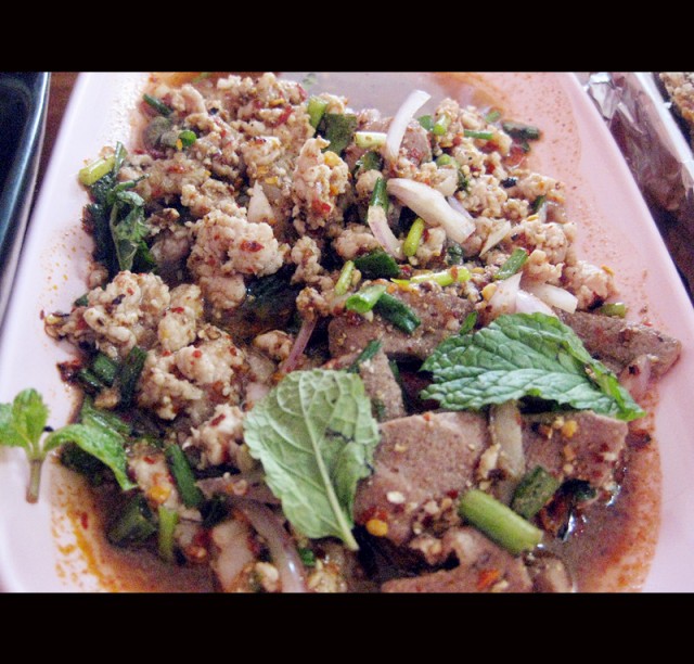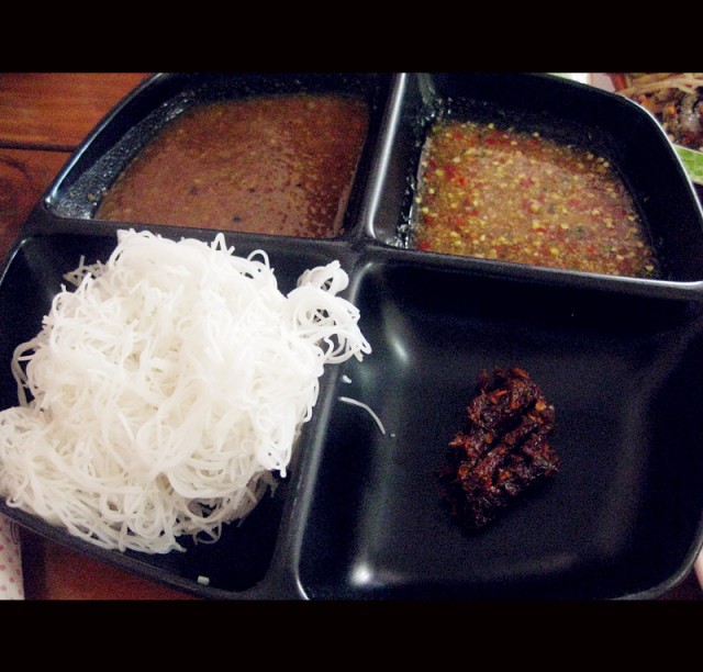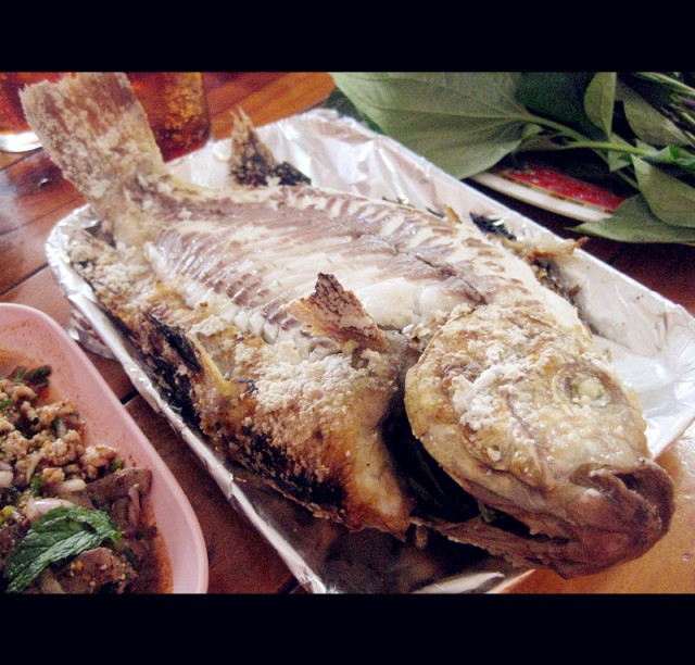 จานนี้เป็นลาบหมูค่ะ รสชาติเปรี้ยวนำ อร่อยใช้ได้ ราคาจานละ 50 บาทอันนี้เป็นน้ำจิ้มที่ทานกับเมี่ยงปลาเผานะคะ แล้วก็มีเส้นหมี่ขาวปลาเผา ตัวใหญ่มากๆ ราคาแล้วแต่ขนาดตัวปลา อย่างวันนี้ตัวนี้ 230 บาทค่ะทางร้านบอกว่าเป็นปลาของ CP สดใช้ได้ เนื้อไม่เละ ไม่คาวด้วยค่ะทางร้านมีซุ้มผักให้เดินไปหยิบเองค่ะ มีผักหลายอย่างเลย เช่นใบชะพลู ผักกาดขาว ผักกาดหอม โหระพา ผักชี ผักชีฝรั่งผักแปลกๆที่เราไม่รู้จักก็มีนะคะ กินแล้วขมมาก