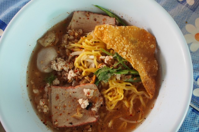 ไปภูเก็ต 2 รอบ ไม่เคยไปทันกินเย็นตาโฟคุณลุงเลยเพราะไปบ่ายคล้อยทุกที เราเลยสั่งบะหมี่เกี๊ยวต้มยำแทนรสปรุงต้มยำจะติดหวาน เพราะเค้าใช้น้ำพริกเผาที่แตกต่างจากที่อื่นรวมๆ แล้วเราชอบมาก ขนาดตอนนั้นยังรู้สึกอิ่ม ยังทานได้หมดชามโดยเฉพาะน้ำซุป เกลี้ยงเกลาไม่เหลือ ที่นี่ทำบะหมี่เองในห้องทางด้านหลัง เป็นสูตรโบราณที่คุณลุงนำติดตัวมาจากเมืองจีนทำให้เนื้อบะหมี่แตกต่างจากที่อื่น คุณลุงคุณป้าใจดีมากคราวก่อนชวนเราเข้าไปดูพี่ชายทำบะหมี่ด้านหลังร้านด้วย ระหว่างนั่งทาน เห็นบางคนมาซื้อเส้นบะหมี่กลับไปด้วย ท่าทางจะเป็นร้านก๋วยเตี๋ยว เกี๊ยวกรอบของที่นี่ก็อร่อย เหมาะจะสั่งมานั่งเคี้ยวกรุบๆ ระหว่างรอก๋วยเตี๋ยวค่ะ …Read More