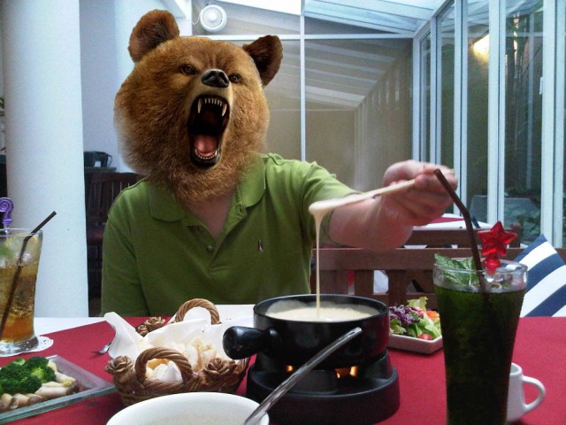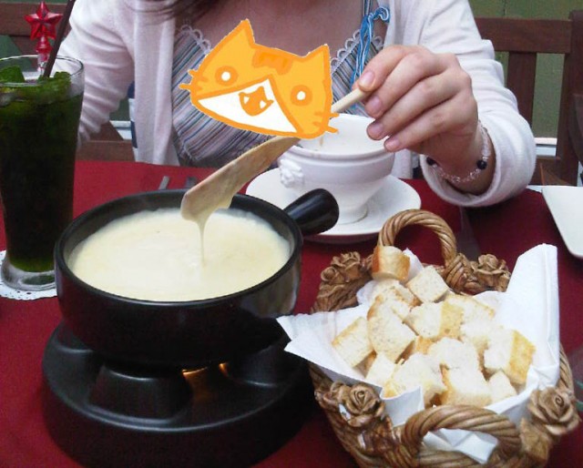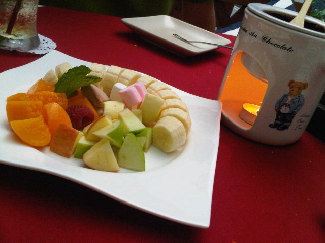 โดยรวมพวกเครื่องเคียงค่อนข้างธรรมดา ซุปหัวหอมใสไปนิดนึง แต่ก็ใช้ได้ค่ะและแล้วก็มาถึงพระเอกของมื้อนี้ ชีสค่ะชีส เสริฟมาบนเตาเล็กๆ น่ารัก อุ่นให้ชีสคงความร้อน และโชยกลิ่นเตะจมูก นาทีนี้ไม่สงไม่สนแคลอรีและไขมันแล้วเจ้าค่ะ จัดเต็มด้วยขนมปังนุ่มๆ จุ่มลงไปในชีสให้ทั่ว พอเข้าปากแล้วจะรู้ว่าสวรรค์มีจริงสองคนซัดกันเกือบเกลี้ยงหม้อ ยิ่งตอนหลังๆ ที่ชีสเกรียมติดก้นหม้อเซรามิคยิ่งอร่อยสุดๆ ไปเลย ชีสที่ปรุงมารสอ่อนๆ ไม่เลี่ยน ใครที่ชอบเค็มก็เติมเกลือลงไปได้ค่ะปิดท้ายมื้อหวานๆ คราวนี้ให้หวานยิ่งขึ้นด้วยฟองดูช็อคโกแลต ขอบอกว่าช็อคโกแลตที่นี่เข้มข้นและอร่อยมากๆ เคยทานร้านอื่นเจอเหลวใสไม่ได้เรื่อง ร้านนี้แค่ชิมก็รู้แล้วว่าเป็นช็อคโกแลตชั้นดี จิ้มกับผลไม้ที่มีทั้งหวาน ทั้งเปรี้ยว ยิ่งเวลาที่เอามาร์ชเมโลลงไปจุ่มจนเกือบละลายแล้วเอาเข้าปากนี่ ไร้คำบรรยายใดๆ เพราะไม่อยากให้อากาศเข้าไปแทรก แถมถ้วยก็เป็นลายหมีน่ารัก คิกขุสุดๆ