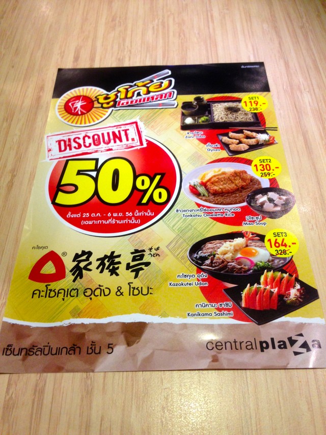 ซูโก้ย โซ้ยแหลก ลด 50% Kazokutei Japanese Udon & Soba 2013-11-06:ร้านคะโซคุเต อุด้ง & โซบะ เซ็นทรัลปิ่นเกล้าชั้น 5 เป็นร้านอาหารญี่ปุ่นประเภท Fast Food ที่มีรายการอาหารให้เลือกไม่มาก อาหารน้อยอย่าง แบบง่ายๆ ข้าวแกงกะหรี่ไข่ออมเลท หมูทอด กุ้งเทมปุระ ปลาแซลมอลชุปแป้งทอด อุด้งต่างๆ ฯลฯ ร้านนี้เป็นเคลือของโออิชิ เลือกที่นั่งตามสบาย ยังไม่เที่ยงเลยไม่ค่อยมีคน ลด 50% ตั้งแต่ 25 ต.ค.-6 พ.ย.56 นี้เท่านั้น (เฉพาะทานที่ร้านเท่านั้น) วันนี้เป็นวันสุดท้านของ Promotion พอดีได้ดูรายการของที่ลด 50% ข้าวแกงกะหรี่ไข่ออมเลทหมูทอด ราคา 229.- มิโซะชุป 30.- -อาหารที่สั่ง ชุด ข้าวแกงกะหรี่ไข่ออมเลท หมูทอด 229.- มิโซะชุป 30.- รวม 259.- ลด 50% เหลือ 130.-ข้างแกงกะหรี่ไข่ออมเลท หมูทอด น้ำแกงกะหรี่จะมีหมูกับเนื้อ เลือกได้อีก ผมไม่ทานเนื้อก็เลยเลือกเป็นหมูครับ ส่วนหมูทอด ก็ชุปแป้งขนมปังทอดได้กรอบนอกนุ่มใน อร่อย เนื้อหมูนุ่มไม่เหนียว ที่แปลกกว่าที่อื่นก็คือมีไข่ออมเลท 1 ฟอง พอผสมผสานกัน ทานแล้วอร่อยมาก ชอบจริงๆครับ เสียดายเป็น Promotion วันสุดท้าย-มิโซะชุป อยู่ในชุด ตบท้าย สดชื่น อิ่มพอดีครับของแถม ตอนชำระเงิน สรุป: อาหารอร่อย จานใหญ่ ลด 50% สุดคุ้มจริงๆ ตอนชำระเงินยังได้รับแถม กรด อะมิโน โอเดพลัส ของโออิชิ 1 ขวด OK มากๆครับ555.....…Read More+ 6The above review is the personal opinion of a user which does not represent OpenRice's point of view.LikeShareซูโก้ย โซ้ยแหลก ลด 50% Kazokutei Japanese Udon & Soba https://s.openrice.com/LcKTa01QyI000Report Post Ratings5Taste5Decor5Service5Hygiene5ValueRecommended Dishesข้าวแกงกะหรี่ไข่ออมเลท หมูทอดDate of Visit2013-11-06Spending Per Head฿130 (Lunch)