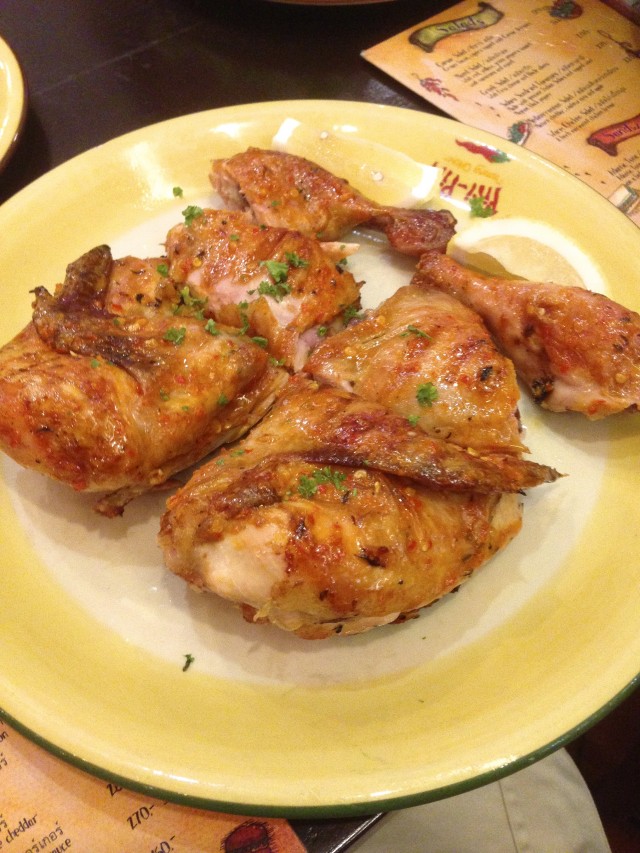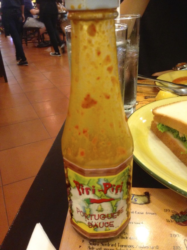 Piri Piri ไก่ย่างสไตล์ Portuguese Piri Piri (พิริ พิริ) 2013-11-11:chopstick:ร้าน พิริ พิริ ร้านอาหารไก่ยางสไตล์ โปรตุเกส ตั้งอยู่ในห้างฯสยามพารากอน ชั้น G -ไก่ย่าง Piri Piri ทั้งตัว รสชาตินุ่ม อร่อย พร้อมซอส Piri Piri ออกรสเผ็ด จิ้มแล้วก็อร่อยอีกแบบ พร้อมมันฝรั่งทอดและสลัดผัก 380.- -มันฝรั่งทอด French Fries ซึ่งอยู่ในชุดไก่ย่าง หั่นชิ้นใหญ่พอควร ทานพร้อมไก่ยางก็อร่อยครับ-สลัดผัก ซึ่งอยู่ในชุดไก่ย่างเช่นกัน -ซอสพริกน้ำจิ้มไก่ย่าง ที่มีรสเผ็ด อร่อยอีกแบบครับ-Atlantic Tuna Sandwich แซนวิสทูน่า ขนมปังกับทูน่า ปรุ่งรส วางบนผัก 2 ชิ้น 190.--Marinara พาสต้าซีฟู๊ดซอสมะเขือเทศ เส้นใส่ซอสมะเขือเทศ ผัดพร้อมกุ้ง ปลา หอยลาย รสชาติดีครับ 320.-สรุป: ไก่ย่าง สไตล์โปรตุเกส พร้อมซอส Piri Piri รสชาติเผ็ดแปลก อร่อยใช้ได้ ทานกัน 4 คน พร้อมน้ำ 1,118.15 บาท รายการทุกรายการ บวก7% บวก10%…Read More+ 2The above review is the personal opinion of a user which does not represent OpenRice's point of view.LikeSharePiri Piri ไก่ย่างสไตล์ Portuguese Piri Piri (พิริ พิริ) https://s.openrice.com/LcKTa01nSe000Report Post Ratings4Taste4Decor4Service4Hygiene4ValueRecommended Dishesไก่ย่างPiri PiriDate of Visit2013-11-10Spending Per Head฿300 (Dinner)