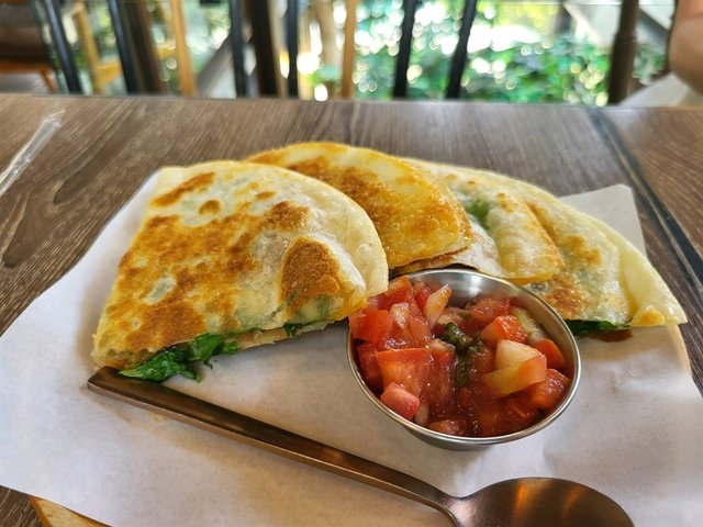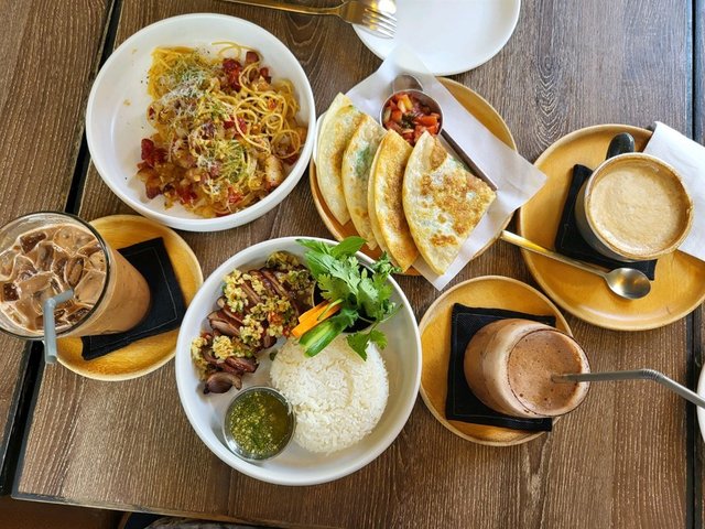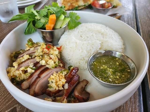 在考山路叫Bolt過來的話不用100銖,餐廳價格在泰國來說有點小貴, 但用餐後個人覺得食物質量也是值的, 每人一食一飲品平均350泰銖一人, 大約港元70, 3人消費總共9XX泰銖。如果經過附近的話十分推薦! 但不建議專程過來。我們一行三人午餐後在這兒坐了很久, 環境舒適寫意, 見有客人在看書也很不錯。注意食物有點偏辣,不能吃辣的要跟服務員說一聲,我們叫了小辣感覺也頗辣。很推介香蒜橄欖油鴨胸飯及類似蔥油餅的小食,味道很香口,飲品相對一般。…Read More