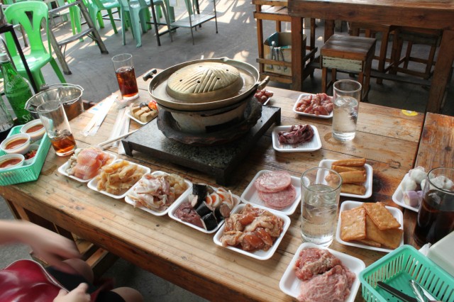 ร้านหมูกระทะเจริญกรุง สาขา 2หน้าร้านเป็นพื้นที่โล่งๆ เตะบอลได้เลย ฮ่าๆๆร้านนี้เครื่องเยอะจริงๆ เรียงรายหยิบเท่าไหร่ก็ไม่หมด มีทั้งของสด ของทอด อาหารทะเลก็มี ซูชิกับแกล้มอื่นๆ ของหวาน ครบเซตขณะกำลังปิ้ง ยัดเข้าไป ฮ่าๆๆ รสชาติใช้ได้ หลักๆ ก็จะชอบเนื้อหมูนั่นแหละ มีหมูหลายแบบไม่รู้ว่าอันไหนเป็นอันไหนเลย เครื่องในก็ครบทุกอย่าง แต่ไส้มันเหนียวไปนิด อาจจะทั่วๆ ไป แต่เยอะแบบนี้กินได้อารมณ์ดี ยิ่งมากินกันหลายๆ คนล่ะก็ มันส์มากผักเริ่มจะนิ่มละ ดูเรียบร้อยขึ้นเยอะสปาเกตตี้ราดซอสมะเขือ มีพวกยำต่างๆ และอาหารสำเร็จอีกหลายอย่างให้เลือกอันนี้ของทอด ข้าวเกรียบจิ้มซอส ของงหวานแบบไทยๆ ใส่น้ำแข็งเย็นๆ หวานชื่นใจ ไอศกรีมก็มีนะโดยรวมแล้วรสชาติอาจจะไม่อร่อยเว่ออะไร แต่น่าจะมาทานบวกบรรยากาศ กับเพื่อนๆ ครอบครัวมากกว่า ทานได้เรื่อยๆ ราคาก็ร้อยต้นๆ ไม่จำกัดเวลา…Read More