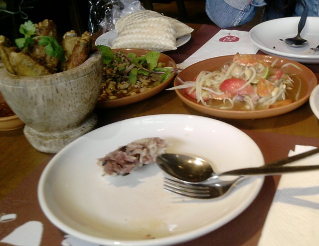 เมนูสุดท้ายถ้าจำไม่ผิดเป็นยำไก่ทอดค่ะ จานนี้อร่อยสุดใน 4 อย่างที่สั่งมา เนื้อไก่กรอบเข้ากับน้ำยำเป็นอย่างดีค่ะ กินไปเรื่อยๆ ก็ไม่รู้สึกถึงความเหนียวนะคะ โดยปกติบางร้านถ้าแช่น้ำไว้นานๆ จะเหนียวไม่อร่อยค่ะ จานนี้หมดก่อนจะเหนียวซะอีก คริคริ สรุปมื้อนี้อิ่มหนำพร้อมเม้าท์มอยสนุกสนาน เป็นอีกร้านที่แนะนำได้ทั้งแบบเฮฮากับเพื่อน และแบบครอบครัวเลยค่ะ …ดูเพิ่มเติม