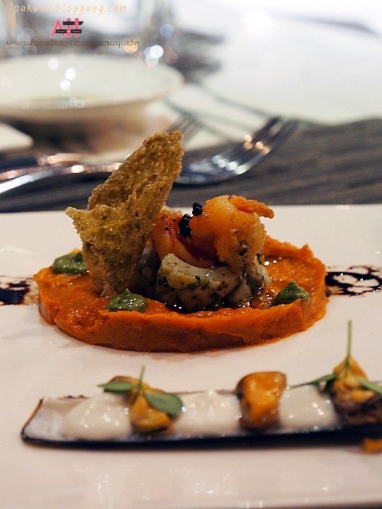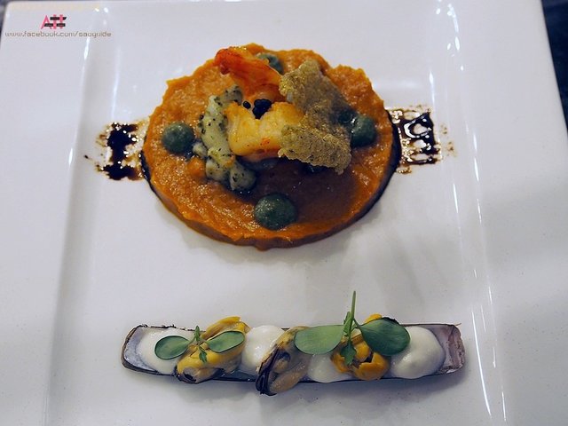 จานต่อไปเป็น Pane, pomodoro e mare (Tomato cream, Tuscan seafood, burrata cheese, caviar and basil chips)