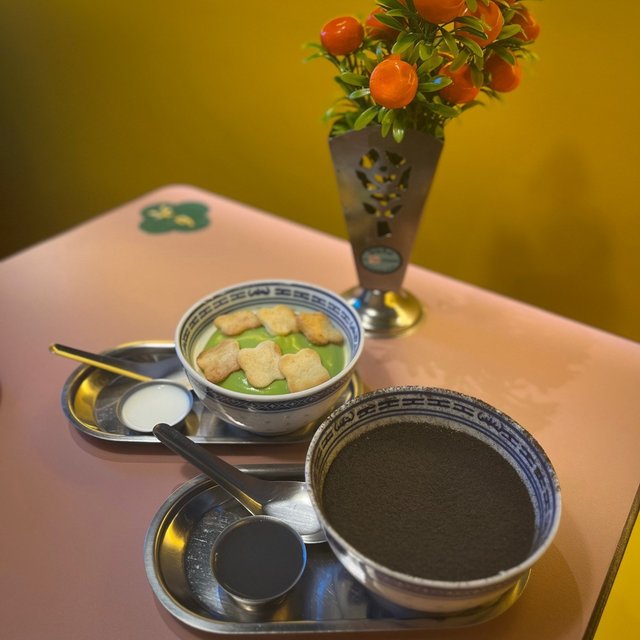 牛奶布丁配黑芝麻粉,另配有芝麻糊,食用時需要淋上布丁上,正宗芝麻糊同芝麻粉非常濃郁