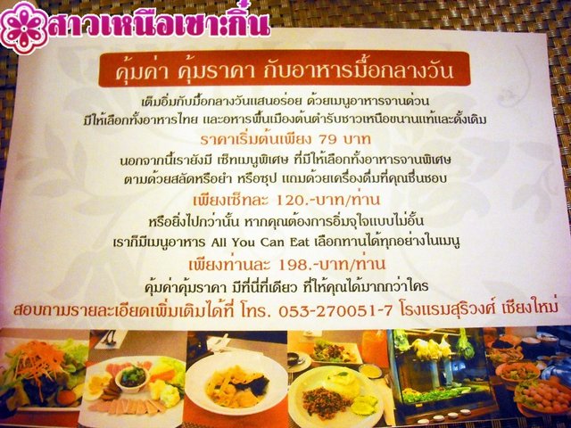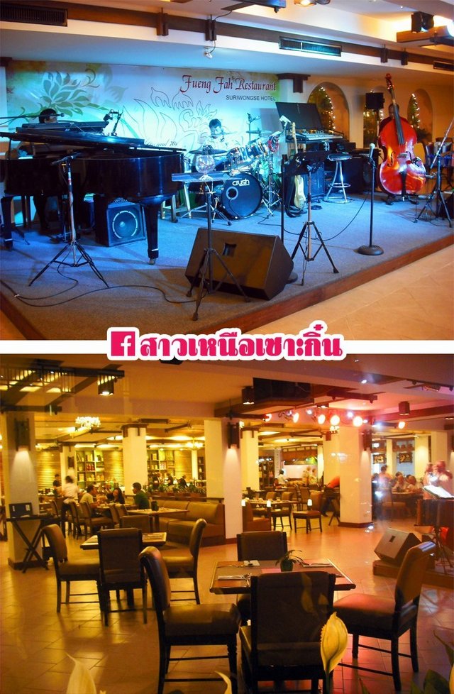 สาวเหนือปึ๊กมารุงรังอีกรอบแล้วเน้อวันนี้มารีวิวร้านอาหารในเทศกาลวันพ่อกันเลยจร้า สำหรับพรุ่งนี้ใครมีแผนจะพาคุณพ่อไปกิ๋นข้าวแลง(ข้าวเย็น)กัน รีวิวนี่สาวเหนือเก็บข้อมูลมาตั้งแต่วันพ่อปีที่แล้ว เลยลองมาให้พิจารณาชมกันโจทย์พาคุณป๊าวัยทองของสาวเหนือไปกิ๋นนั้น คุณป๊ารีเควสมาว่า ขอราคาถูก มีหลากหลาย ไม่เอาหมูกะทะยันปิ้งย่าง ที่นั่งกว้าง ไม่เอาคนเยอะ ไม่เอาร้านหรู มีที่จอดรถ ถ้ามีเพลงเก่าๆสมัยยุคเอลวิสฟังด้วยจะดีมาก........แหม๊ คุณลูกเกิดทันสมัยเบิร์ด ธงไชย อัลบั้มแรก(หมายถึงเกิดตอนอัลบั้มนั้นวางแผงนะ แต่โตไม่ทันฟัง) จะไปหาร้านแนวนี่ที่ไหนในเชียงใหม่หว่าพอดีในปีนั้น สาวเหนือตามข่าววงการร้านอาหารในเชียงใหม่ ก็ได้ข่าวมาว่า โรงแรมสุริวงศ์ ได้รีโนเวลห้องอาหารใหม่แล้ว ราคาบุพเพ่ต์คนละไม่เกิน 200 บาท เป็นอาหารไทยทั้งหมด มีที่จอดรถ มีเพลงเก่าสมัยอิฉันยังไม่เกิด...ก็เข้าโจทย์คุณป๊าเป๊ะ เลยบอกคุณป๊าให้มาที่นี่เลย...ห้องอาหารเฟื่องฟ้าเจอโปรอาหารในประกาศนี่มา เห็นราคาไม่แพง ก็ได้กลายเป็นเป้าหมายในการเก็บรีวิวไปในตัว (จะหาอะไรกิ๋นนอกบ้านทั้งที ต้องได้ทำรีวิวให้ไม่เสียเที่ยว) แต่รีวิวตั้งปีที่แล้ว สาวเหนือยังไม่แน่ใจว่าโปรนี่ยังอยู่ไหมนะค่ะ แต่คิดว่าน่าจะยังอยู่ ยังไงลองสอบถามกับทางโรงแรมอีกทีเพื่อความชัวร์โรงแรมสุริวงศ์ตั้งอยู่ใจกลางสี่แยกไนท์บาซาร์เลย ตรงข้ามกับร้านแมคโดนัลล์ ตรงข้ามกับโรงแรมเลอ เมริเดียน และเซ็นทาราดวงตะวัน (บอกกันขนาดนี่น่าจะไปถูกกันแล้วนะ) ถ้านับอายุก็เป็นโรงแรมรุ่นผู้ใหญ่ในย่านนี่เลย เรียกว่าสองโรงแรมหลังยังไม่เกิดด้วยซ้ำ...เมื่ออายุมากเข้า โรงแรมรุ่นน้องเค้าก็ปรับตัวกันให้ใหม่ให้นึ้ง คุณพี่จะมัวเป็นรูปแบบเดิมโบราณก็ดูจะไม่เข้าสมัย เลยทำการรีโนเวลใหม่ซะ พอโซเซียลมีเดียเข้ามามีบทบาท ทางโรงแรมก็ทำประชาสัมพันธ์ราคาห้องพักราคาถูกด้วย (วันที่สาวเหนือไป เจอกรุ๊ปทัวร์จีนอีกแระ)แต่นอกจากการรีโนเวลห้องพักแล้ว ยังมีการรีโนเวลห้องอาหารของโรงแรม หนึ่งในนั้นคือ ห้องอาหารเฟื่องฟ้า ซึ่งอยู่ด้านล่างของโรงแรม(ติดกับสตาร์บัค)โดยมีการทำประชาสัมพันธ์ว่า เป็นห้องอาหารกลางวัน-เย็น ในรีวิวนี่สาวเหนือจะพาไปกิ๋นดินเนอร์ข้าวตอน ที่ว่าบุพเพ่ต์หัวราคา 198 บาทนั้นแหละ(มารู้ทีหลังว่าราคานี่ไม่รวมเครื่องดื่มตอนเข้าไปกินแล้วนี่ซิ)...เอารถไปจอดในโรงแรม เดินลงมาถึงหน้าห้องอาหาร ก็เจอประตูทางเข้าแบบนี้ เห็นตอนแรกคิดว่าสไตล์จีนเสียอีก...บรรยากาศภายในห้องกว้างจริงๆ เฟอร