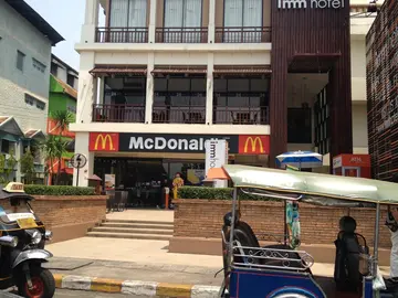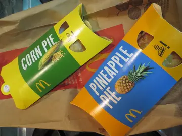 เดินเล่นตลาดนัดในเชียงใหม่ที่มีเฉพาะช่วงสุดสัปดาห์แถวท่าแพหน้าโรงแรม IMM ท่าแพ มีร้านแมคโดนัลด์ เลยแวะไปนั่งตากแอร์สักพักพี่พนักงานเชื้อเชิญว่าจะรับอะไรดี คืนนั้นคนเต็มร้าน มีต่างชาตินั่งกันเต็มเกือบทุกโต๊ะรวมทั้งผู้ที่มาพักโรงแรมด้วย เราเลยได้ตากแอร์แค่แว้บเดียวสั่งพายไส้ข้าวโพด กับ สับปะรด มาอย่างละอันพายโปรดเราคือไส้สับปะรด เนื้อพายข้างนอกทั้งร้อนทั้งกรอบ ไส้สับปะรดมีเนื้อเป็นชิ้นๆไหลทะลักถ้ารีบกิน ร้อนแทบลวกปากกันเลยทีเดียว ส่วนพายข้าวโพดเรายกให้เพื่อน แต่ก็แอบขอชิมไป 1 คำ เนื้อพายข้างนอกแป้งเหมือนกัน ไส้ข้าวโพดออกไปทางซุปมากกว่า รสชาติออกเค็มและข้นๆยังไงสับปะรดก็ชนะเลิศ