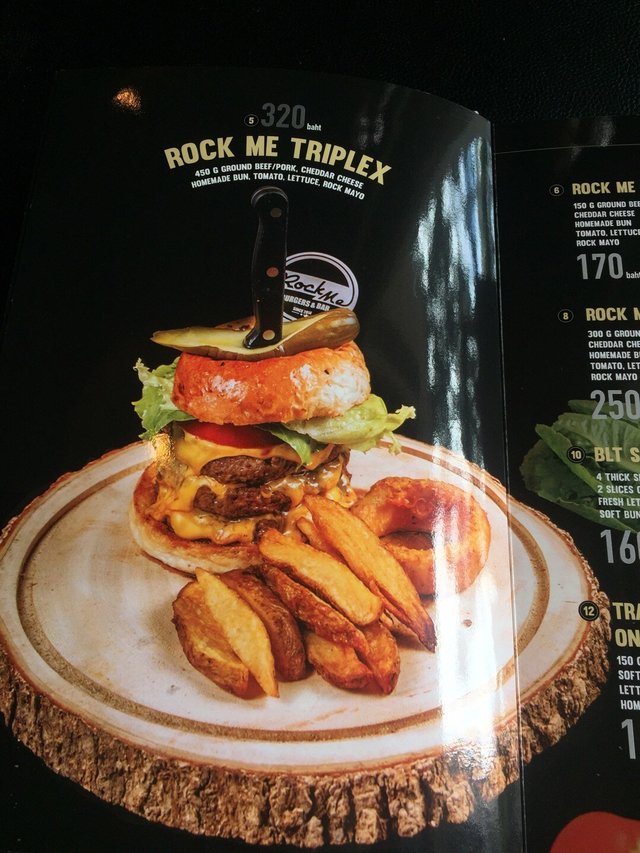 เมนูแรกคือเมนูแนะนำ Rocking on Heaven (190 บาท) ซึ่งสามารถเลือกได้ว่าเป็นหมูหรือเนื้อ เราเลือกสั่งแบบหมูค่ะ จะเป็นเบอร์เกอร์โฮมเมด สอดไส้ด้วยหมูสับหมักเครื่องเทศหอมกลิ่นเครื่องปรุงอร่อยมาก ๆ ค่ะ เนื้อหมูสับมีความชุ่มฉ่ำดีมาก ๆ เลย ในเบอร์เกอร์สอดไส้ด้วย Cheddar Cheese, Scrambled Egg มะเขือเทศ เบคอน ผักกาดแก้ว ราดด้วยซอสมาโย ใครอยากจัดหนักต้องเมนูนี้เลยค่ะ ครบเครื่องจริง ๆ เสิร์ฟพร้อมหอมทอด และมั่นฝรั่งทอดมาแบบเหลืองกรอบ ร้อน ๆ เลย โรยเกลือนิด ๆ เสิร์ฟมาบนจานแบบเขียงไม้ มีมีดปักมาให้เบอร์เกอร์ไม่ขยับได้ เสียบบนแตงกวาดอง ตกแต่งมาดูเท่ห์ ๆ ดีค่ะ
