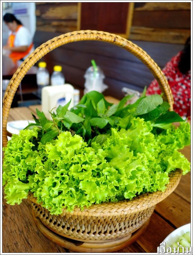 ร้านเฮือน่านเป็นร้านอาหารเวียดนาม – อีสาน และอาหารทั่วไปครับ โดยแหนมเนืองที่เป็นเมนูเชิดหน้าชูตาของร้านนั้นเป็นแหนมเนืองเจ้าดังจากทางภาคอีสานครับ เจ้าของบล็อกสั่งแหนมเนืองชุดใหญ่ ราคา 280 บาท มีหมู 8 ไม้ แป้งห่อ 1 ตั้งใหญ่ๆ ที่ต้องบรรยายถึงขนาดนี้เพราะ “ลืมถ่ายรูปมา” คงเป็นเพราะทุกคนหิวมาก ก็มันเลยเวลาทานข้าวกลางวันของที่บ้านเจ้าของบล็อกมานานแล้ว พออาหารมาเสิร์ฟเป็นอย่างแรกก็เลยไม่สนใจอย่างอื่นแล้ว ได้รูปตะกร้าผักตะกร้าใหญ่มาเป็นหลักฐานให้เห็นว่าสั่งแหนมเนืองจริงๆ ตะกร้าผักใหญ่มากๆครับ แถมผักในตะกร้าก็มีหลากหลายมาก ที่สำคัญเป็นผักปลอดสารพิษด้วย