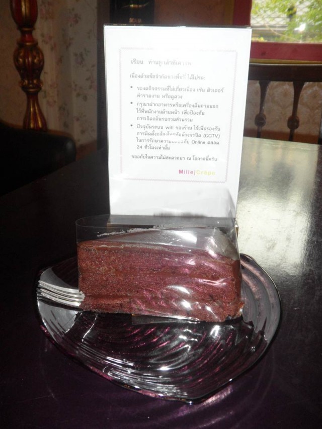 Mille Crepe......มาถึงก็สั่งFrosting Chocolateคะ...ราคา95บาทรสชาติFrosting Chocolateจะคล้ายๆกับเค้กบราวนี่เลยนะคะแต่แค่ว่าเนื้อเค้กของร้านนี้จะนิ่มกว่าแล้วเนื้อเค้กก็จะร่วนๆกว่าความเข้นข้นของช็อกโกแลตถือว่าอยู่ในเกณฑ์ที่เข้มข้นโอเคเลยคะบรรยากาศร้านสะอาดสะอ้าน ตกแต่งร้านงดงามมากอยู่ใกล้กับปากซอยพระศุลี ที่จอดรถของร้านไม่มี แต่ที่นั่งกินมีนะคะการบริการของพนักงานดีมากๆคะ แต่กฏของทางร้านคือไม่ให้นั่งติวหนังสือกันภายในร้านนะคะเนื่องจากร้านมีพื้นที่จำกัดน่ะคะแล้วถ้าใครคิดจะทำรายงานติวหนังสือสไตล์นี้ต้องไปหาที่นั่งชิวที่ร้านอื่นๆแทนแล้วล่ะคะ…ดูเพิ่มเติม