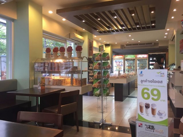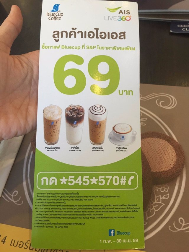 พอดีเราได้รับข้อมูลมาว่า ร้านเอสแอนด์พี กำลังมีโปรโมชั่นเป็นชุดข้าวแช่พร้อมข้าวเหนียวมะม่วง เซ็ตละ 295 บาท (จากปกติ 350 บาท)แค่เห็นโปรโมชั่นก็หิวแล้วจ้า มันเหมาะกับหน้าร้อน + อากาศร้อนแบบนี้สุดๆเลย โดยส่วนตัวอยากลองรับประทานข้าวแช่มานานละ พอเจอแบบนี้พลาดไม่ได้เด็ดขาด! ภายในร้านของสาขานี้จะแบ่งออกเป็น 2 โซน คือ โซนเบเกอรี่ และ โซนสำหรับนั่งทานภายในร้าน พอเราได้ที่นั่งก็สั่งชุดอาหารดังกล่าว และเหลือบไปเห็นโปรโมชั่นส่วนลดกาแฟบลูคับ สำหรับลูกค้า AIS ก็จัดไปด้วยเลยอย่าให้พลาดมีให้เลือก 4 เมนูด้วยกัน ทุกเมนูลดเหลือ 69 บาทกาแฟเย็นบลูไอซ์ (ปกติ 85 บาท)ลาเต้เย็น (ปกติ 100 บาท)คาปูชิโน่เย็น (ปกติ 100 บาท)คาปูชิโน่ร้อน (ปกติ 95 บาท)โปรนี้มีถึงวันที่ 30 เมษายน 2559 นี้นะคะระหว่างรออาหารที่สั่ง เห็นกระดาษรองจานน่ารัก ขอเก็บภาพไว้ละกัน ^^รอสักพักกาแฟก็มาเสิร์ฟค่ะ กาแฟเย็นบลูไอซ์ : สำหรับกาแฟเอสแอนด์พีต้องยอมรับว่าขึ้นชื่อเรื่องความเข้มของกาแฟและความหอมมันของนม ดื่มไปทีตาสว่างเลยทีเดียว แก้วนี้ราคา 69 บาทข้าวแช่: การสั่งข้าวแช่ที่นี่พนักงานจะถามก่อนว่าจะรับเป็นชุดข้าวแช่ดอกมะลิหรือดอกอัญชัน ดูในรูปก็ไม่ใหญ่นะ แต่พอมาเสิร์ฟนับว่าเป็นเซ็ตที่ใหญ่มาก!! คือดีนะที่ไปกับเพื่อนอีกคนไม่งั้นมีจุกแน่ ในเซ็ตจะประกอบไปด้วยข้าวแช่ดอกมะลิ (แน่นอนสิ) เครื่องเคียงข้าวแช่ประกอบด้วย กระปิทอด หมูฝอยหวาน พริกหยวกสอกไส้ปูจ๋า และ ไชโป้วหวาน และผักสดต่างๆ มาในรูปแบบสวยงามประดิษฐ์ประดอย มะม่วงที่มีการแกะสลัก ชุดนี้ถ้าเป็นชุดแยกปกติไม่รวมข้าวเหนียวมะม่วงน้ำดอกไม้ ราคา 225 บาทความคิดแรกที่เข้ามาคือ ปกติเค้ากินยังไงเนี่ย เหอๆ เพื่อนเราบอกว่าแช่ของทอดลงไปในข้าวเลย แต่เรากลัวเละเลยขอทานแบบจับของทอดมาห่อกับผักสดแล้วกินข้าวพร้อมน้ำกลิ่นมะลิเย็นชุ่มฉ่ำ แล้วตามด้วยเครื่องที่ห่อผักเมื่อกี้ความรู้สึกแรกที่รับรู้ได้คือหอมมากและเครื่องเคียงก็อร่อยรสชาติเข้ากันทุกอย่างเลย (อร่อยทุกอย่างจริงๆนะ) ทานอย่างมีความสุขมาก ทีเด็ดของเครื่องเคียงจริงๆคือของทอดชิ้นใหญ่ซึ่งไม่ทราบจริงๆว่าคืออะไร ตามภาพ รู้แต่ว่าชอบรสชาติของมันมากที่สุดแล้ว และจานนี้ไม่ว่าจะจับคู่ผัดสดและของทอดอะไรก็แล้วแต่มันมีรสชาติที่เข้ากันหมดเลยหั่นให้เห็นภายใน ว่าเนื้อแน่นจริงๆข้าวเหนียวมะม่วง : มะม่วงสุกชุ่มฉ่ำเสิร์ฟพร้อมข้าวเหนียวมูล 2 สีและกะทิราด สำหรับจานนี้ต้องขอบอกว่ามะม่วงหวานกำลังดีเข้ากันกับความมันของข้าวเหนียวมูลกะทิ ไม่รู้จะบรรยายอย่างไร แต่รับรอ