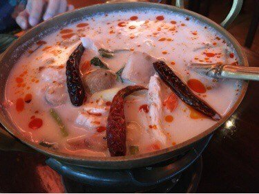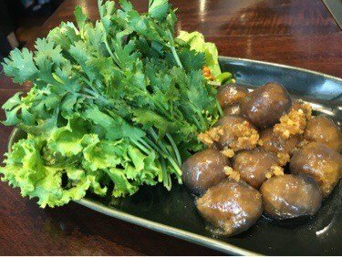 豬肉團子半透明既粉團入面包左豬肉碎,出面就撒左花生碎,有d似咸湯圓!係香港既泰國餐廳好少見!團子本身就咸咸地,加埋旁邊既香菜食,味道不錯!依個冬蔭公湯真係好好飲!味道好豐富,又辣又酸,好多香料既香味!草菇等配料吸哂湯底既精華!好正