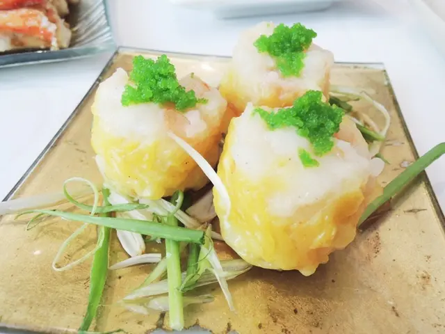 เกี๊ยวหอยเชลล์ผักปวยเล้ง 95 บาท ติ่มซำจานนี้ตอนเสิร์ฟมามันเตะตาเรามากๆเลยล่ะ ยิ่งบอกว่าเป็นหอยเชลล์กับปวยเล้งยิ่งว้าวมาก กินแล้วก็แปลกดีนะ เหมือนจะเป็นปวยเล้งที่ผัดกับหอยเชลล์ตัวเล็กๆ แล้วนำมาทำเป็นไส้ ส่วนแป้งแบบนี้ก็อร่อยค่ะ เหนียวๆนุ่มๆ เข้ากับไส้เลย