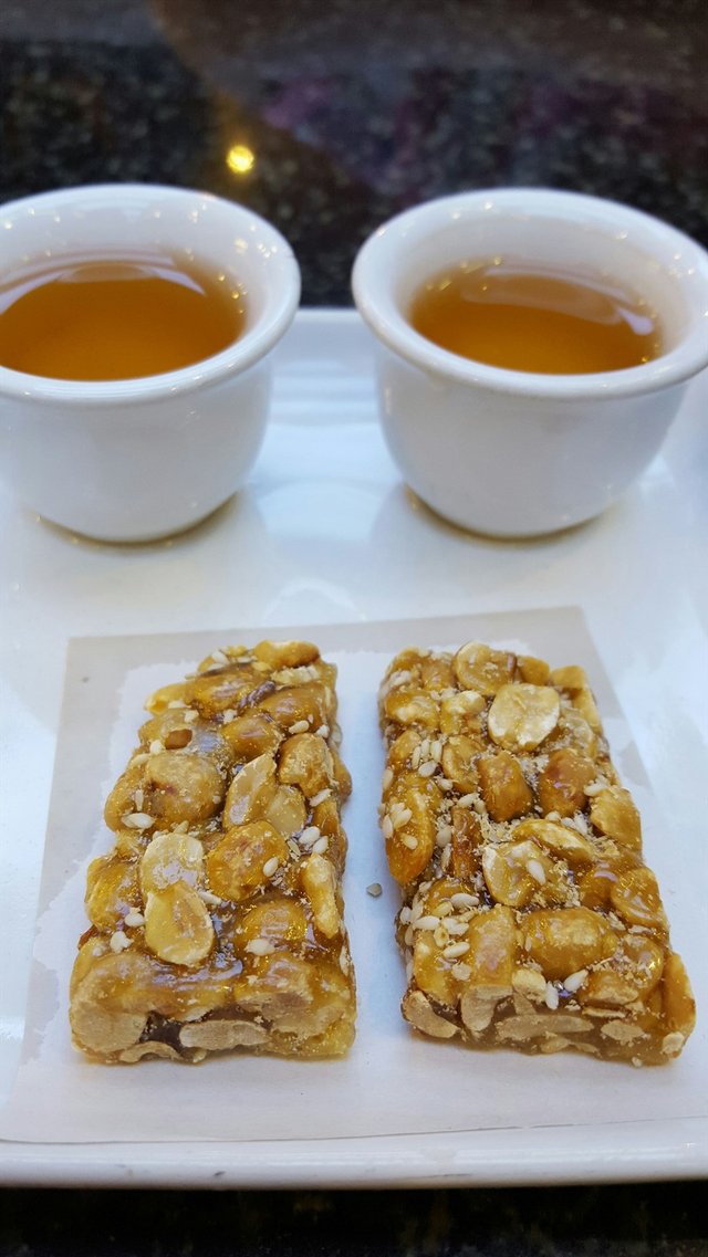 มาถึงก็จะมีขนมถั่วตัดและชาร้อนมาถ้วยเล็กๆ ตามจำนวนคนที่มาทาน