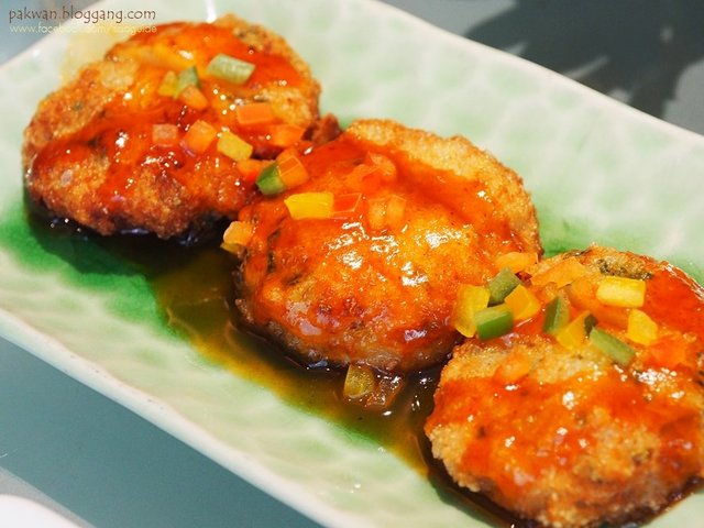 พริกหยวกเจี๋ยนซอสเป๋าฮื้อ ใช้หมูบดและกุ้งบดยัดไส้ ปรุงรสด้วยซอสสูตรพิเศษจากเชฟค่ะ เป็นอีกเมนูที่ไม่ได้ชิมเช่นกัน แหะๆ