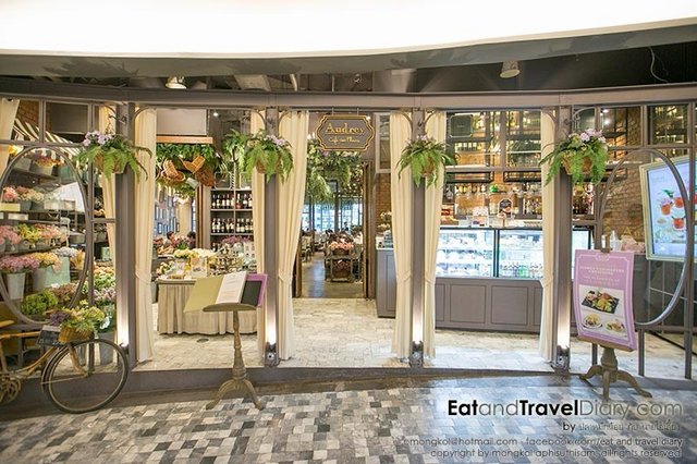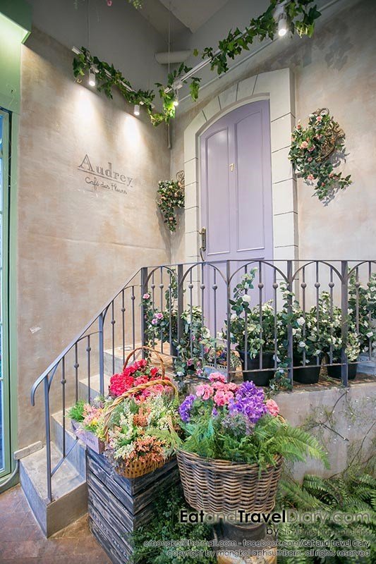 ซึ่งร้านอาหารในเครือ Audrey นั้นรับรองได้เลยว่าบรรยากาศสวยงาม น่านั่งทุกร้าน ทุกสาขา และสำหรับ Audrey Café des Fleurs นั้นก็สวยสะดุดตาตั้งแต่ทางเข้า ไปยันมุมด้านในสุดของร้าน เพราะที่นี่ตกแต่งด้วยธีมสวนดอกไม้สไตล์ฝรั่งเศสย่านโพวองซ์ ซึ่งบรรยากาศด้านในเต็มไปด้วยความสดใน ความสดชื่นของไม้ประดับที่วางเรียงรายอยู่หน้าร้านและมุมต่างๆ โดยมีการแบ่งพื้นที่ 3 โซน ด้านในร้านโซนตรงกลางเป็นเหมือนบรรยากาศในบ้านที่ตกแต่งด้วยผนังกระจกสลับกับปูนที่มีการประดับด้วยกรอบรูปเรียงรายอยู่เต็มผนัง