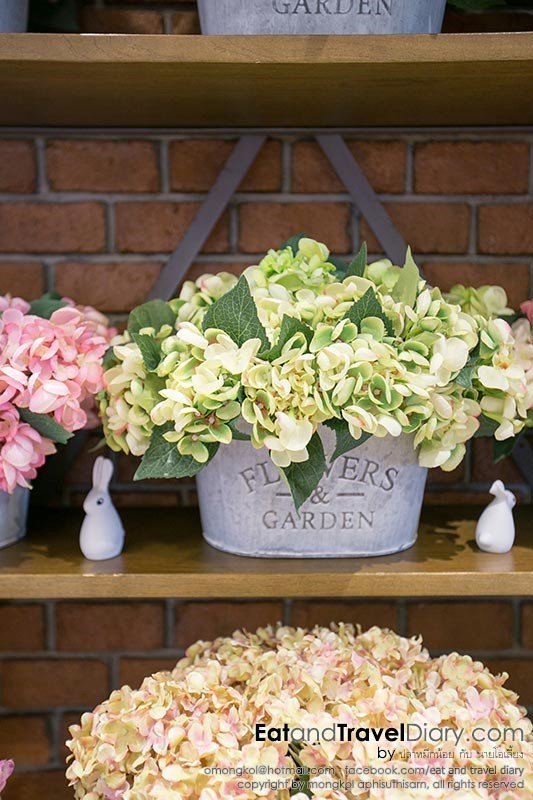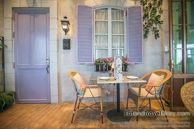 ถัดออกไปด้านในก็จะเป็นบรรยากาศในสวนหน้าบ้าน ซึ่งมุมนี้น่ารักด้วยประตูไม้และหน้าต่างสีพาสเทล ดูสดใส พื้นก็ทำให้เหมือนเป็นถนนอิฐ และมุมนี้ได้รับแสงจากผนังกระจก ทำให้บรรยากาศส่วนนี้คล้ายกับสวนดอกไม้ที่อยู่ที่ฝรั่งเศสจริงๆ นอกจากนี้วิวจากมุมนี้ก็ทำให้มองเห็นตึกสูงย่านสุขุมวิท ซึ่งดูแล้วก็เพลินตาไปอีกแบบ ส่วนตัวแล้วผมชอบมุมนี้มากๆ ครับ