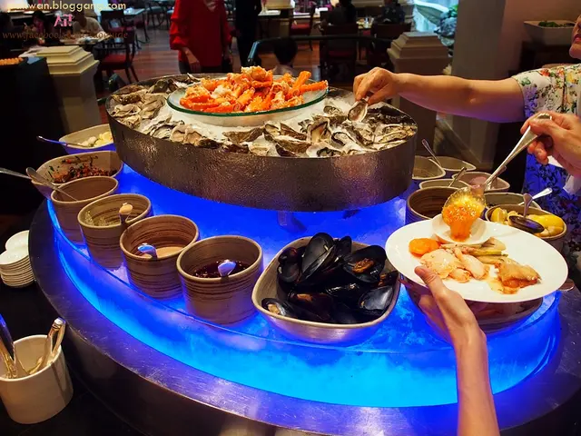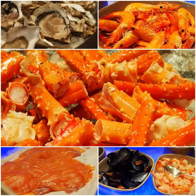 ไลน์นี้จะมีทั้งหอยแมลงภู่ กุ้งขาว แซลมอนรมควัน กุ้งแชบ๊วย หอยนางรม ก้ามปูอลาสก้าค่ะ น้ำจิ้มซีฟู้ดที่นี่ดีอยู่นะคะ ใช้พริกแดงแหละ