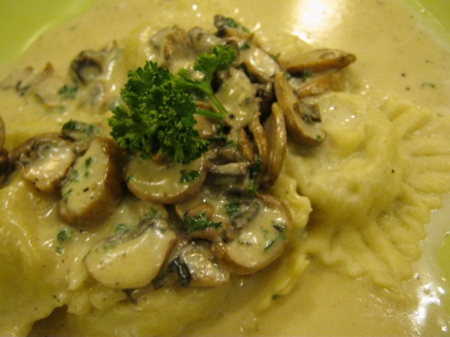 เดินเล่นอยู่แถวประตูท่าแพ มองไปจะเห็นร้าอาหารที่ดูเก๋มีสไตส์ น่าสนใจ และเต็มไปด้วยชาวต่างชาติ เลยขอแฝงตัวเข้าไปชิมอาหารสไตส์อิตาเลียนที่ร้านนี้สักหนอย อาร์ต คาเฟ่ พอสั่งเสร็จ ตามแบบร้านอิตาเลียนต้องเสิร์ฟหนมปังมาให้กินเล่นก่อนดูบรรดาเครื่องปรุงก็น่าสนใจนะ โดยเฉพาะน้ำส้มสตอร์วเบอรรี่โยเกิร์ต เย็นชื่นใจจ้าจานแรก ราวีโอรี ซอสเห็ด ครีมมี่ได้ใจจ้าซุปเห็ด พร้อมหนมปังกรอบ แกล้มมาด้วย สลัดทูน่าจ้า มีน้ำสลัดให้เลือกหลายอย่างเลย เลือกไม่ถูก ลงเอยที่น้ำมัน น้ำส้ม (บัลซามิค) สุดโปรด