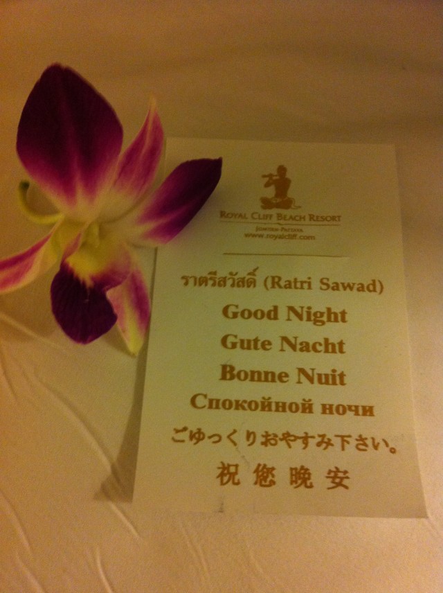 พอดีมีโอกาสไปเยี่ยมบ้านเพื่อนคุณแม่ที่ชลบุรี คราวนี้เค้าพาเข้าไปที่พัทยา ทานข้าวกันสักเล็กน้อย เบาๆค่ะ เค้าเลี้ยงทั้งหมดไปกินกันที่ร้านลานทอง เป็นห้องอาหารของโรงแรม Royal Cliff โรงแรมหรู 5 ดาวเลยค่ะห้องอาหารนี้เป็นห้องอาหารไทยค่ะ อาหารทะเลก็มีเพราะเค้าติดทะเลนี่หน่า อาหารไทยมีหลากหลายเลยค่ะ หน้าตาน่าทานทั้งนั้นรสชาติอาหาร รสชาติเราว่าเข้มข้นตามแบบฉบับอาหารไทยดีค่ะ แต่บางอย่างอาจจะลดความจัดจ้านบ้างเพราะชาวต่างชาติก็เยอะ แต่เครื่องต่างๆจัดเต็มดีค่ะ โดยเฉพาะอาหารทะเลตัวใหญ่ๆ สดๆ ทั้งนั้นเลย ประทับใจค่ะราคา ก็ตามสถานที่นะคะ แต่ละจาน 100 อัพทั้งนั้น ราคาสูงค่ะ แต่เนื่องจากเราไม่ได้จ่ายเอง ไม่ค่อยเดือดร้อน 555เมนูที่สั่งในมื้อนี้มีทั้งหมด 7 เมนูค่ะ ตามรูปที่ถ่ายมานะคะ