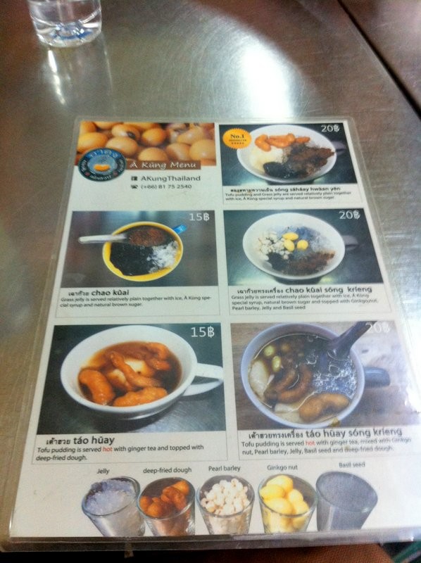 ไปไหว้พระแถวพระนคร เหนื่อยๆ ร้อนๆ เลยหาอะไรเย็นๆกิน เลยได้แวะร้านอาคุงเต้าฮวย ที่เค้าว่ากันว่าอร่อยเป็นตำนาน เปิดมาตั้งแต่รุ่นยายไปบ่ายๆ ร้านโล่งไม่ค่อยมีคน ร้านก็จะมีขายข้าวด้วย แต่ตอนไปถึงเหมือนหมดแล้ว คุณป้าเจ้าของเอาเมนูมาให้ชม เมนูสวยงามทันสมัย หลักๆ ก็มีเต้าหู้ เต้าฮวย ใส่เครื่องเคียงเช่น ปาต้องโก๋ เฉาก๊วย เต้าฮวย เวลาสั่งแนะนำให้จิ้มเมนูเอา เพราะถ้าบอกแล้วป้าจะงง สั่งให้ผิดๆ ถูกๆ ดังที่เราเจอ สั่งน้ำเต้าหู้มา 3 คน แต่ option ต่างกัน บอกป้าแกไป ได้ถูกมาคนเดียว -,,-แต่ไม่เป็นไรกินได้ไม่มีปัญหา แก้วที่นี่น่ารักมีหูจับ แก้วใหญ่ดี ราคาประมาณ 15-25 บาทเนื้อเต้าฮวยเราว่าเฉยๆ อ่ะ แอบมีกลิ่นเต้าหู้ด้วย ไม่ชอบ แต่น้ำเต้าหู้อร่อยดี ใส่ปาต้องโก๋กรอบด้วย อร่อยเลย ดับร้อนได้ เติมพลังก่อนไปไหวพระต่อสุดท้ายคิดเงิน ป้าลดให้ด้วย แก้วที่สั่งมาผิด เพราะป้าเอาอันที่แพงกว่ามาให้กิน ป้าเลยลดให้เหลือราคาเท่าอันที่สั่งไป