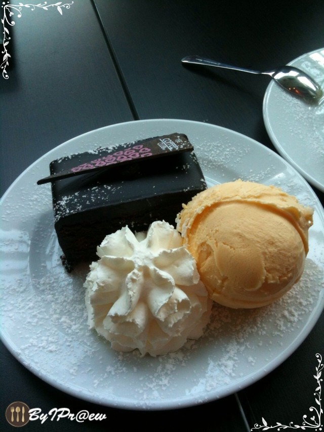 ที่ร้านนี้มีเมนูหลากหลายเลยค่ะมีทั้งกาแฟที่ราคาเริ่มต้นตั้งแต่ 80 - 165 บาท แล้วก็เมนูอาหารทานเล่นด้วยค่ะพวกสลัด แซนวิส จานหลักก็มีนะคะ สปาเก็ตตี้ ผัดไทย ฯลฯ ขนมเค๊กที่จัดไว้ในตู้ด้านหน้าก็สีสันน่าทานทั้งนั้นเลยแต่ว่าวันนี้เราสั่งเป็น chocolate mud cake แล้วสั่งไอศกรีมด้วยก็เพิ่มเงินอีก 20 บาท ในจานนี้จะมีเค๊กหน้านิ่ม 1 ชิ้นจะเป็นเหมือนช็อคฟรัดเค๊ก ขนมปังนุ่มมากราดด้วยช็อคโกแลตหวานๆที่แบบจัดเต็มขนมปังเนื้อนุ่มแบบแทบจะละลายในปากเลยกินคู่กับวิปปิ้งครีมที่รสชาติมันๆเนื้อเนียนมากแล้วก็ไอศกรีมชาไทยหวานหอม เป็นอะไรที่ลงตัวมากเลยค่ะ